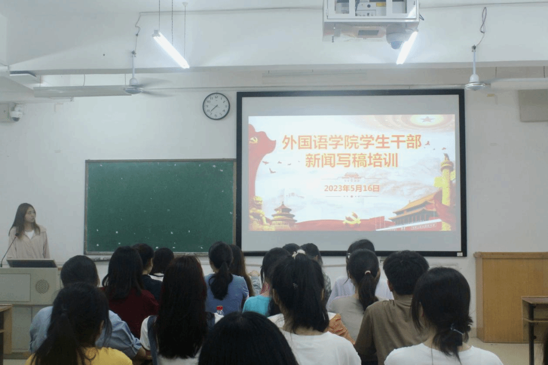 为了进一步提升我院学生干部新闻报道的写作能力和技巧,提高我院宣传工作质量和水平,5月16日晚上,我院于外语楼北309教室开展学生干部新闻写作培训。本次培训由新闻传播学院陈泓霖主讲,我院辅导员陈琴主持,20余名学生干部参加。