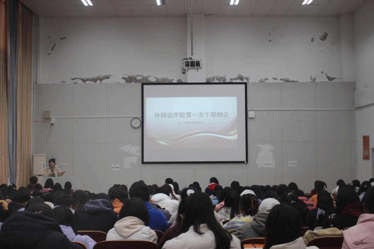 3月3日下午13:00,我院于外语楼北110教室召开了本学期第一次干部例会。学院党总支副书记欧阳竹、学工办主任邱国周、辅导员老师龚晨阳、陈琴、刘志伟出席会议,全体学生干部参加此次会议,会议由主席团干事张荩允主持。