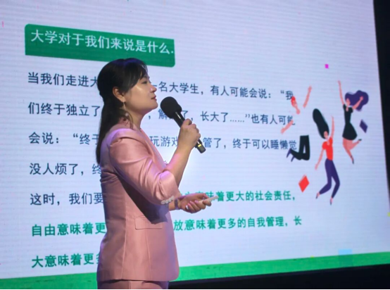全场稍作休息后,贺琴琴带来主题为“新起点,新目标”的讲座,继续为新生们指明努力的方向。首先,贺书记与新生们进行问答互动,提出问题:“你所憧憬的大学生活是什么样的?”同学们积极回答。随后,就“大学是什么?”“大学该如何度过?”“大学应该学会什么?”以及“怎么应对新生适应期?”四个问题进行经验分享。