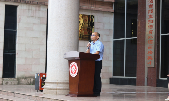 随后,院长刘剑为2022级新生致辞。他首先对外院新同学们的加入表示最热烈的祝贺与欢迎,并对刚步入大学的新生们提出了几点建议:时刻作好吃苦的准备、选择好自己的发展方向和学会管理好自己的时间。他对全体新生寄予期望:希望他们见贤思齐,在大学生活中不负青春和阳光,不负诗与远方!