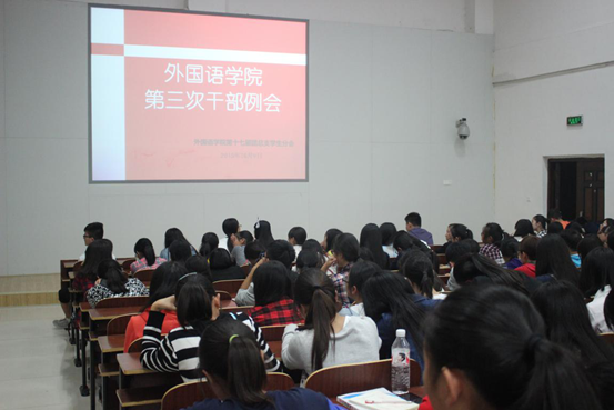 10月9日晚,yL23411永利集团官网登录于外语楼北110召开了本学期第三次干部例会。此次会议由学生会主席刘珏华同学主持,出席会议的有党总支副书记何芳、团总支书记张倩老师、辅导员老师邱国周、江子丹以及全体学生会成员、各年级委员会主任、各年级班委成员。