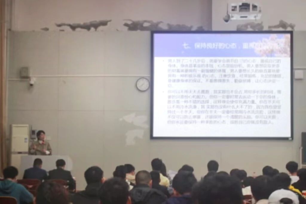 欧阳竹从“成功男士的十五个表现”轻松引入主题,成功调动同学们的兴趣,希望同学们养成自信、自立、自强的好品质;鼓励同学们勇于挑战自我、砥砺争先,结合自身情况踊跃报名征兵。