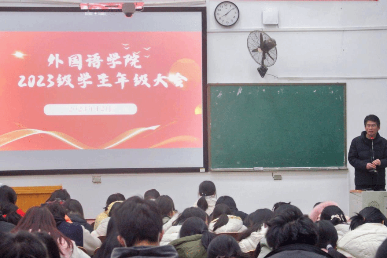 岁末将至,敬颂冬绥。随着期末考试周的临近,为提醒同学们考试注意事项及放假相关安排,12月21日,学院分别于外语楼北101、301教室召开2023级学生年级大会。会议由邱国周老师主持,2023级全体学生参加。