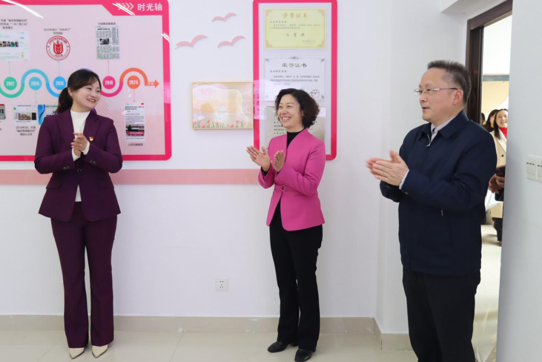 参观完精彩的作品展出之后,杨兰英一行移步至“她世界”女生教育工作室。通过对工作室内陈列的历年活动照片、荣誉证书和优秀作品的讲解,杨兰英对工作室特色活动、“她世界”二十年的发展历程以及育人成果有了深入了解。