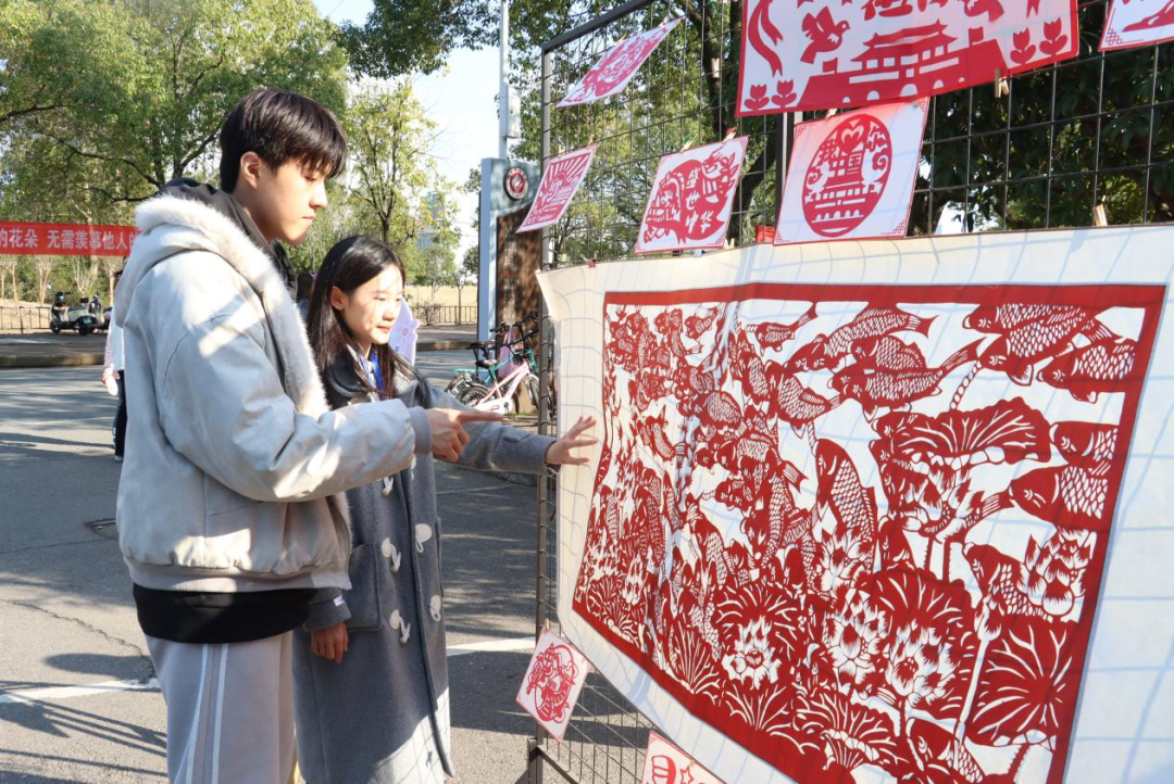 活动现场,非遗工艺品琳琅满目,传统文化氛围浓郁,吸引了全院师生的广泛关注与积极参与。美术学院2023级研究生、剪纸非遗传承人王嘉鑫在活动现场为同学们带来了生动的剪纸艺术讲解。作为剪纸艺术的青年传承人,王嘉鑫一直致力于推广并创新这一传统技艺。在他的指导下,同学们积极参与剪纸创作,活动现场气氛热烈。剪纸艺术的细腻精巧,让同学们在实践中深刻体会到了传统技艺的精妙与匠心精神。