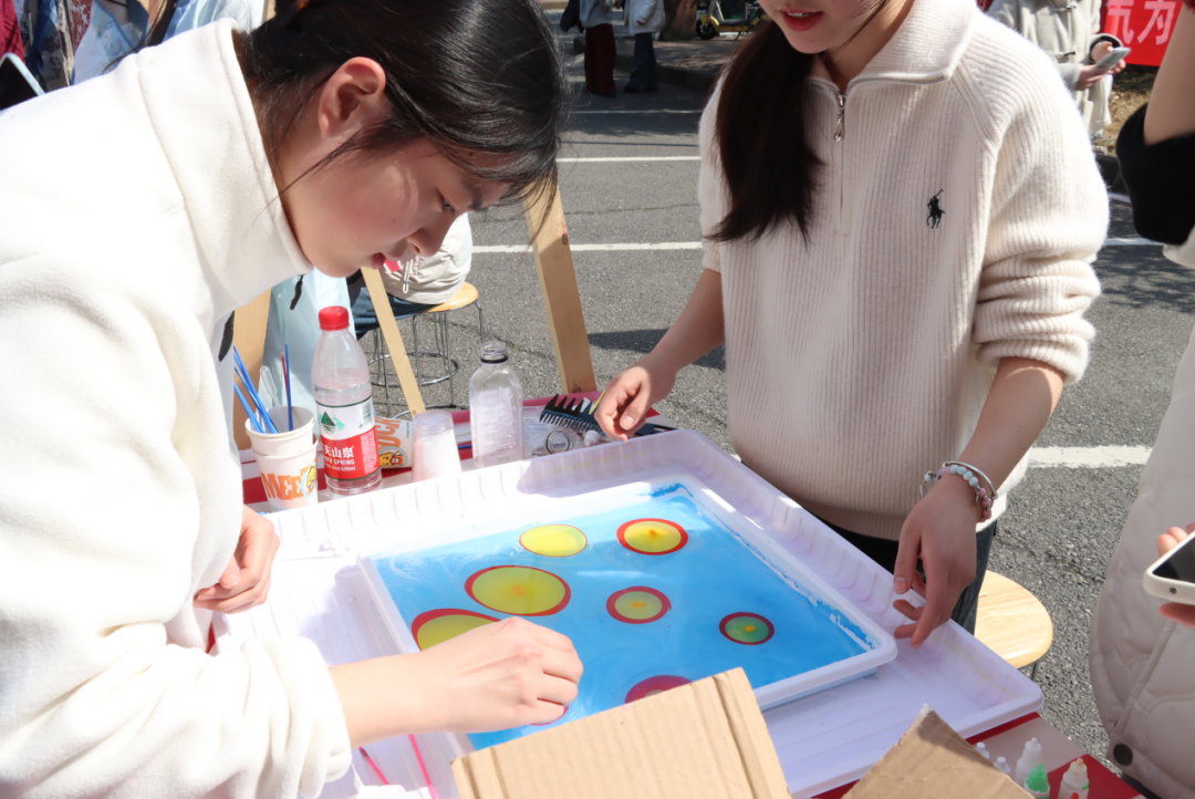 除了剪纸艺术,活动现场还设有多个非遗互动区,展示了丰富多彩的非遗文化,如金箔画、螺钿手工、水拓丝巾等。在京剧脸谱互动区,同学们手持画笔,在空白脸谱上勾勒出独特的图案。与此同时,讲解员向同学们介绍:“每一种色彩、每一道纹样都承载着特定的文化寓意,如红色代表忠勇、黑色象征刚直……”同学们一边动手绘制脸谱,一边认真聆听,脸上写满了对传统文化的敬畏与好奇。“通过参与这些非遗手工艺品的制作,我更加明白了传承非遗文化的重要性。”一位参与活动的同学表示,“作为年轻一代,我们要用创新的思维和方式,让非遗文化在现代社会中焕发出新的活力。”在此次活动中,同学们不仅通过动手实操亲身体验了传统技艺的精妙,更通过聆听非遗背后的故事,深入理解了其文化内涵与历史意义。