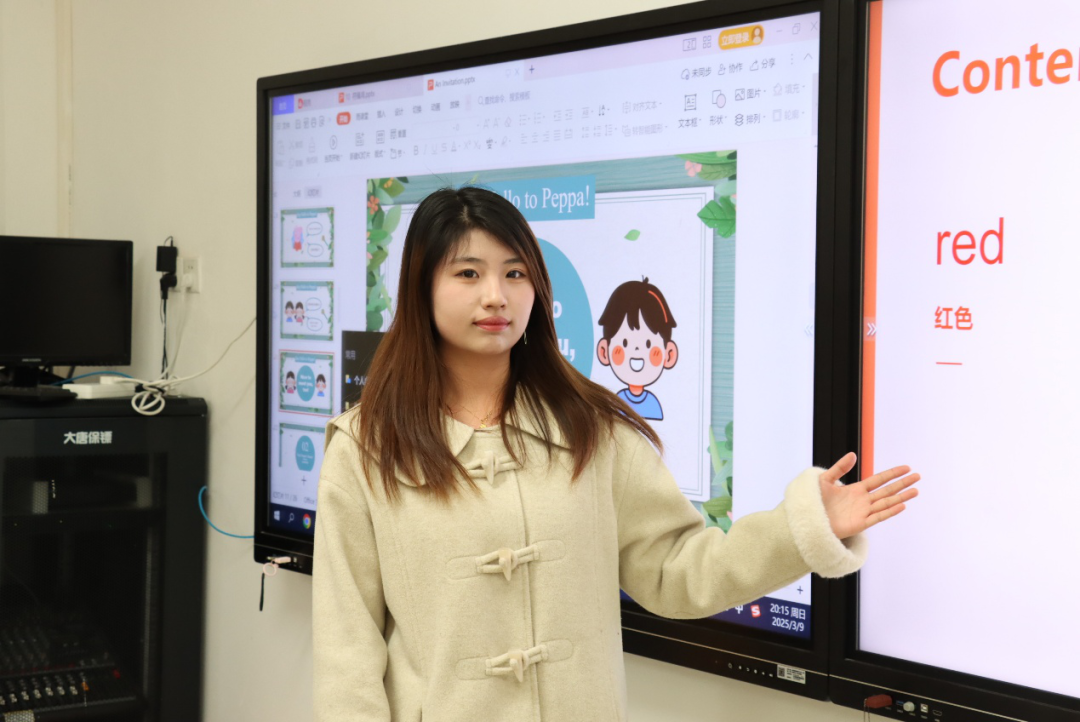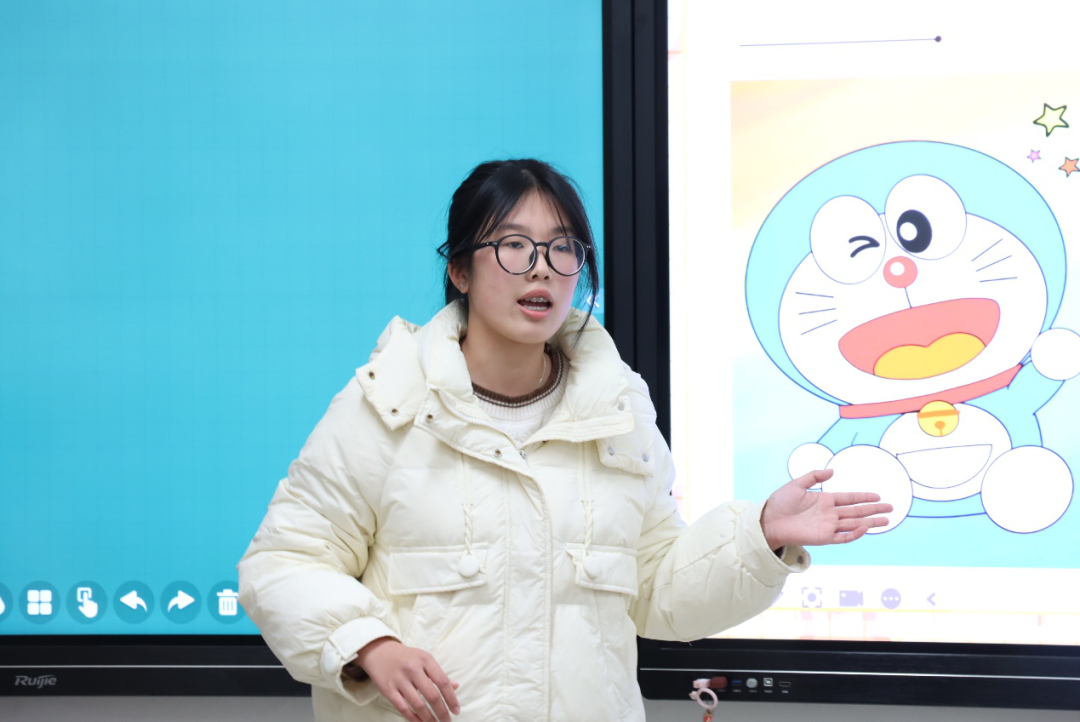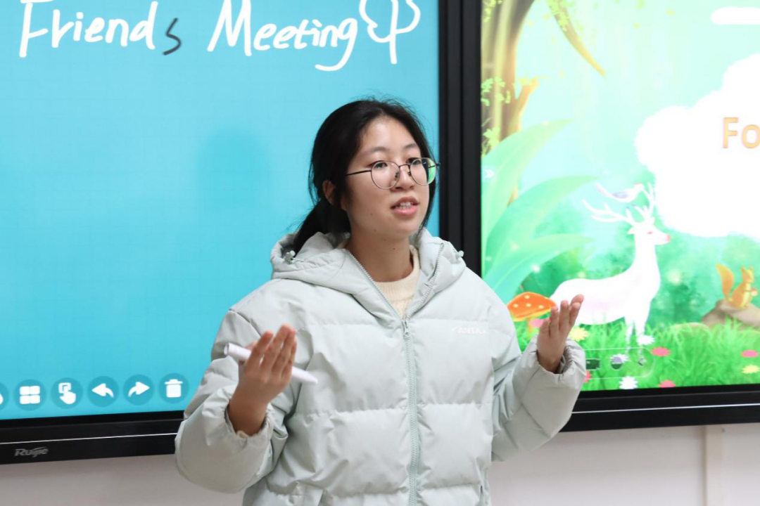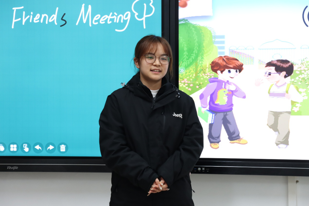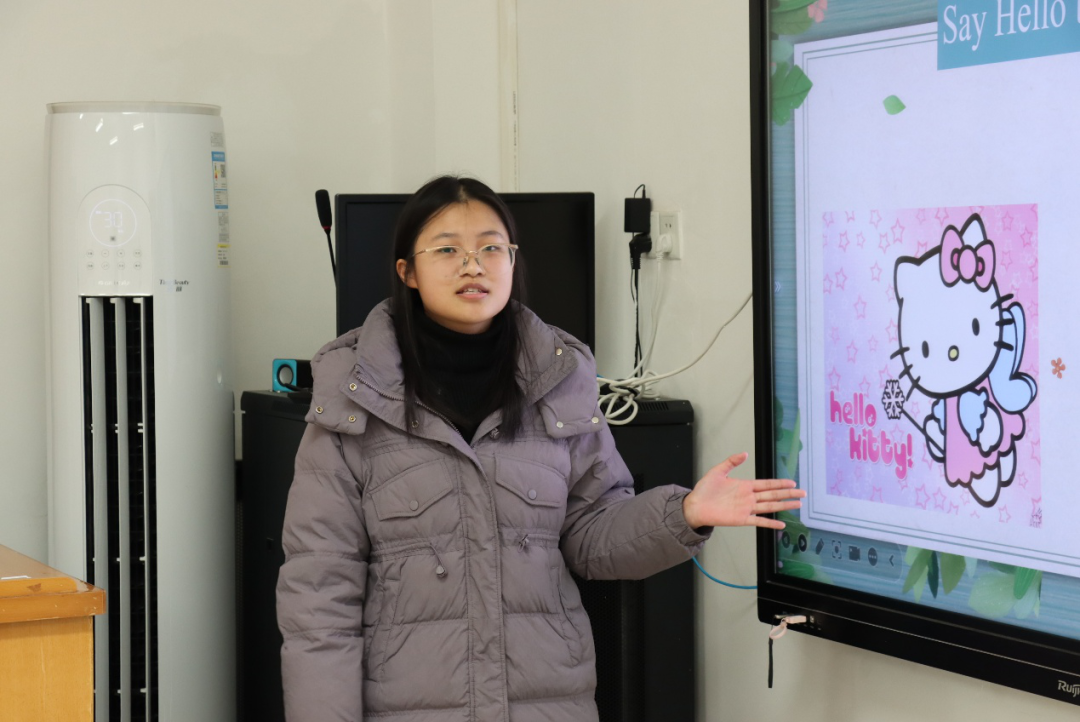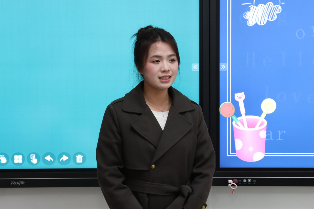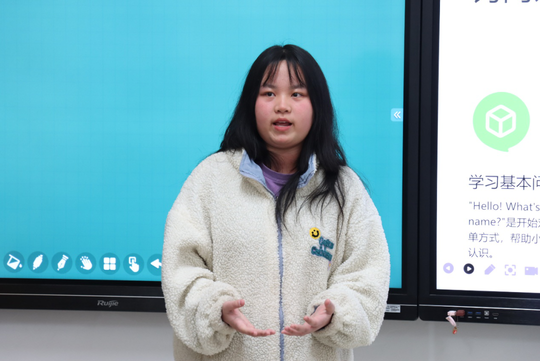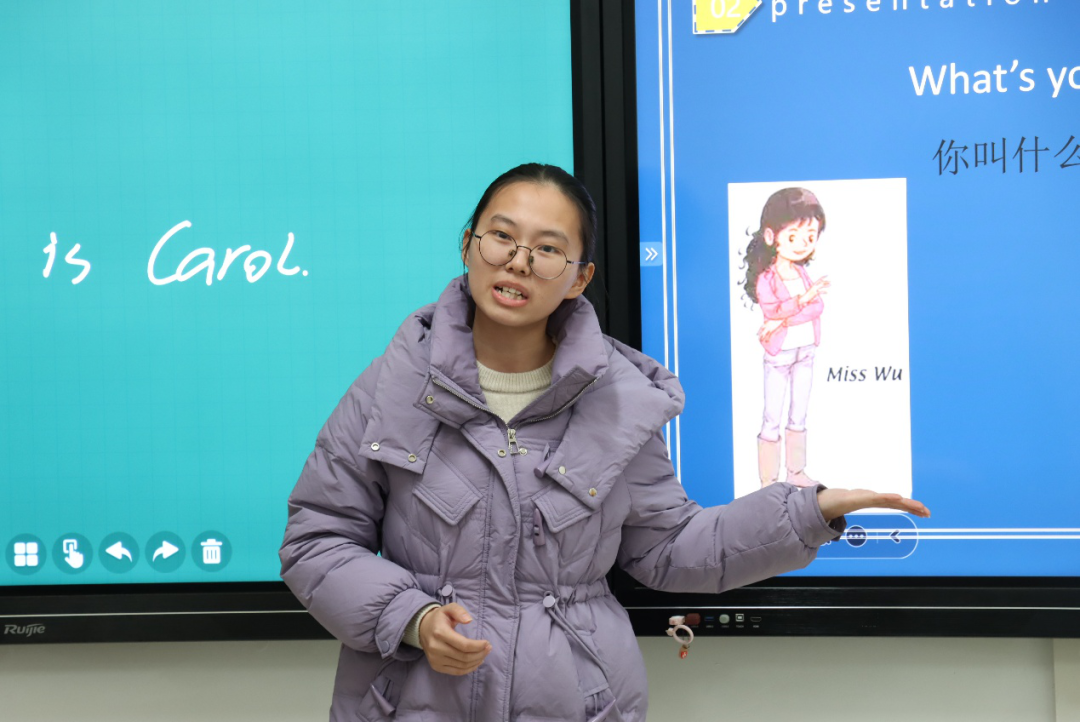 核心环节“课程展示”要求选手们模拟真实课堂,围绕“What’s your name?”这一主题设计趣味教学方案。有的选手通过借助角色扮演的形式,让学生用英语互相询问名字,在沉浸式体验中掌握句型 ;有的则利用热门英文儿歌,将教学内容融入欢快轻松的旋律中,让课堂充满了欢声笑语。