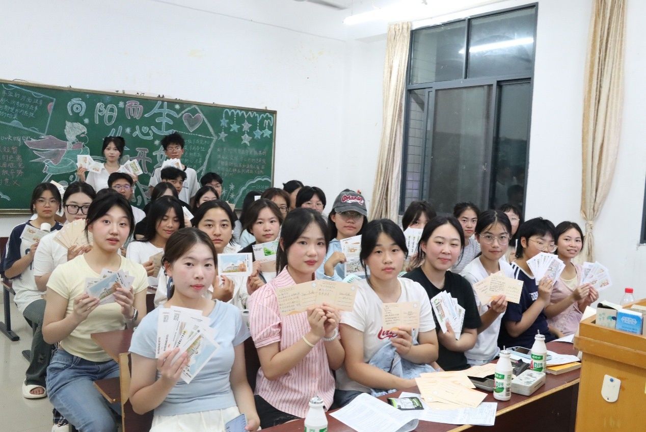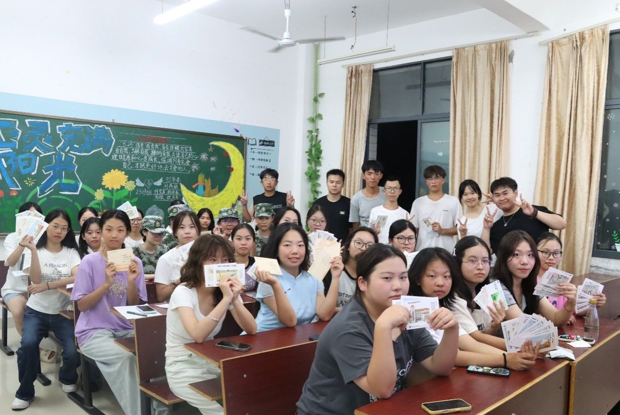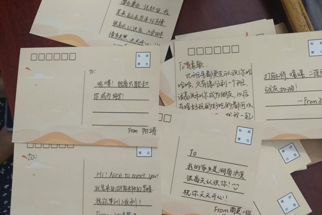 书写完毕后,开启了温馨的“漂流”时刻:有人将明信片送给军训中互相纠正军姿、并肩坚持的“战友”,为共同的汗水与成长点赞;有人递向刚刚完成才艺表演的同学,用文字肯定对方的光芒;还有的同学将明信片赠予默默付出的班导与班助,“谢谢班导近段时间的照顾,您辛苦了!”简单的话语,却满含温暖与敬意。一句句真诚的话语,一张张承载心意的明信片,成为打破陌生的“破冰符”,原本安静的自习室逐渐响起欢快的交谈声,陌生感在笔墨流转中消散,团结友爱的氛围愈发浓厚。