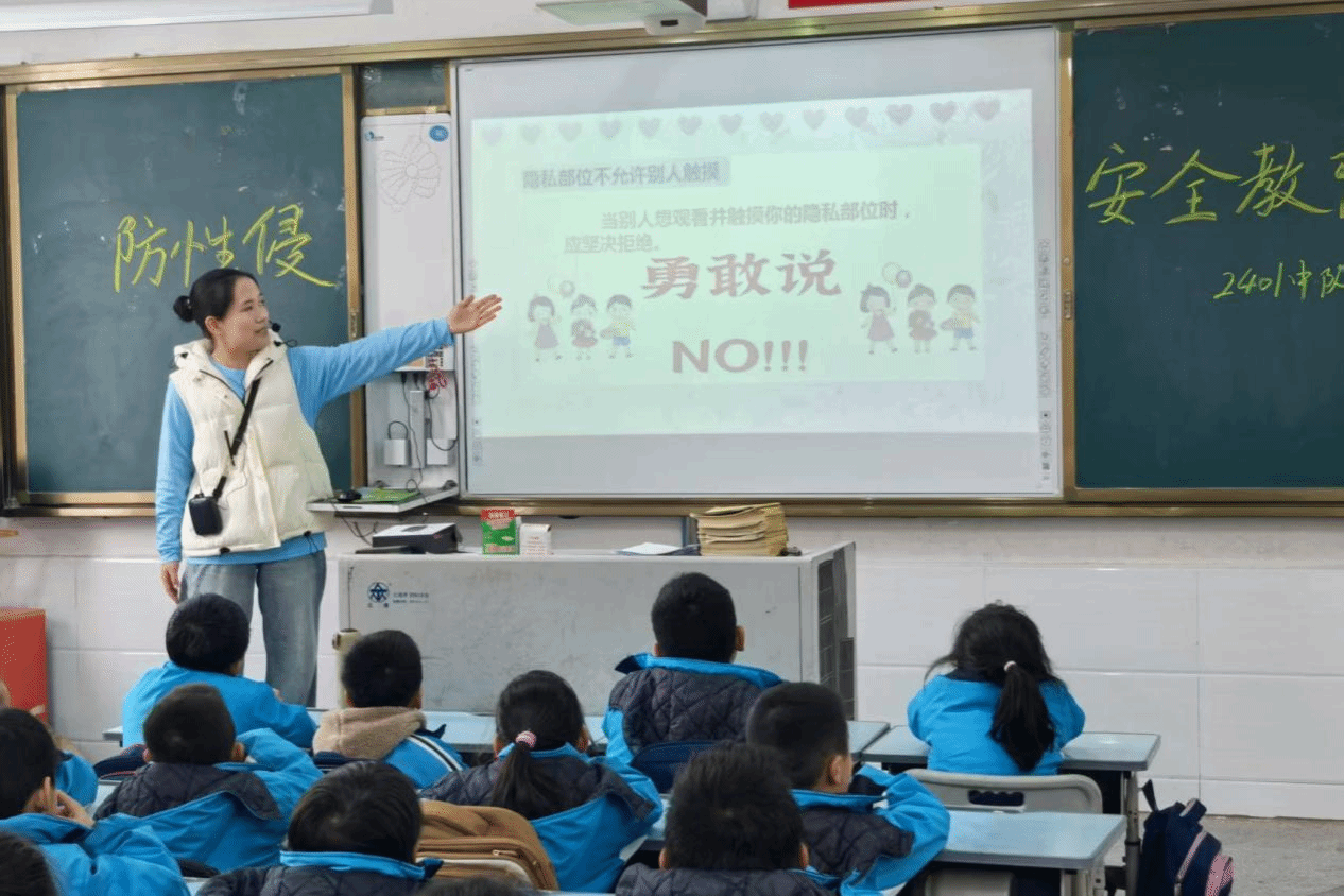 面对“性侵害”这一严肃话题,宣讲团避开复杂术语,把它转化为孩子能理解的“坏接触”:“有人碰你、让你觉得不舒服,就是坏接触。”“那防性侵要防什么呀?”“坏接触!”孩子们齐刷刷举手,脆生生的回答像小鼓点,敲出最清晰的安全认知。
