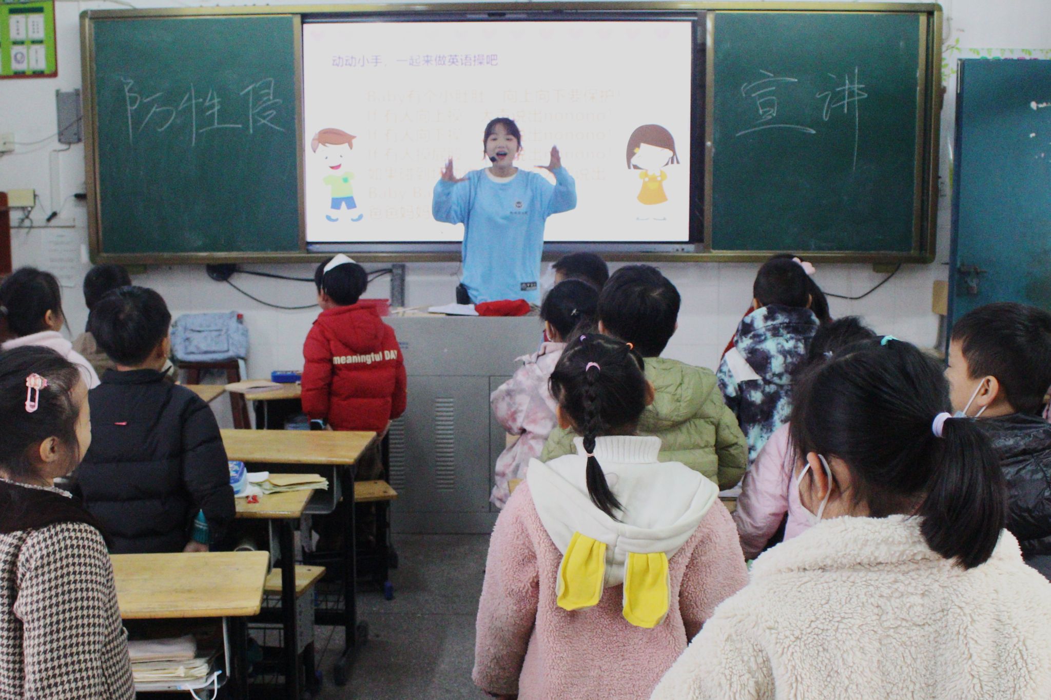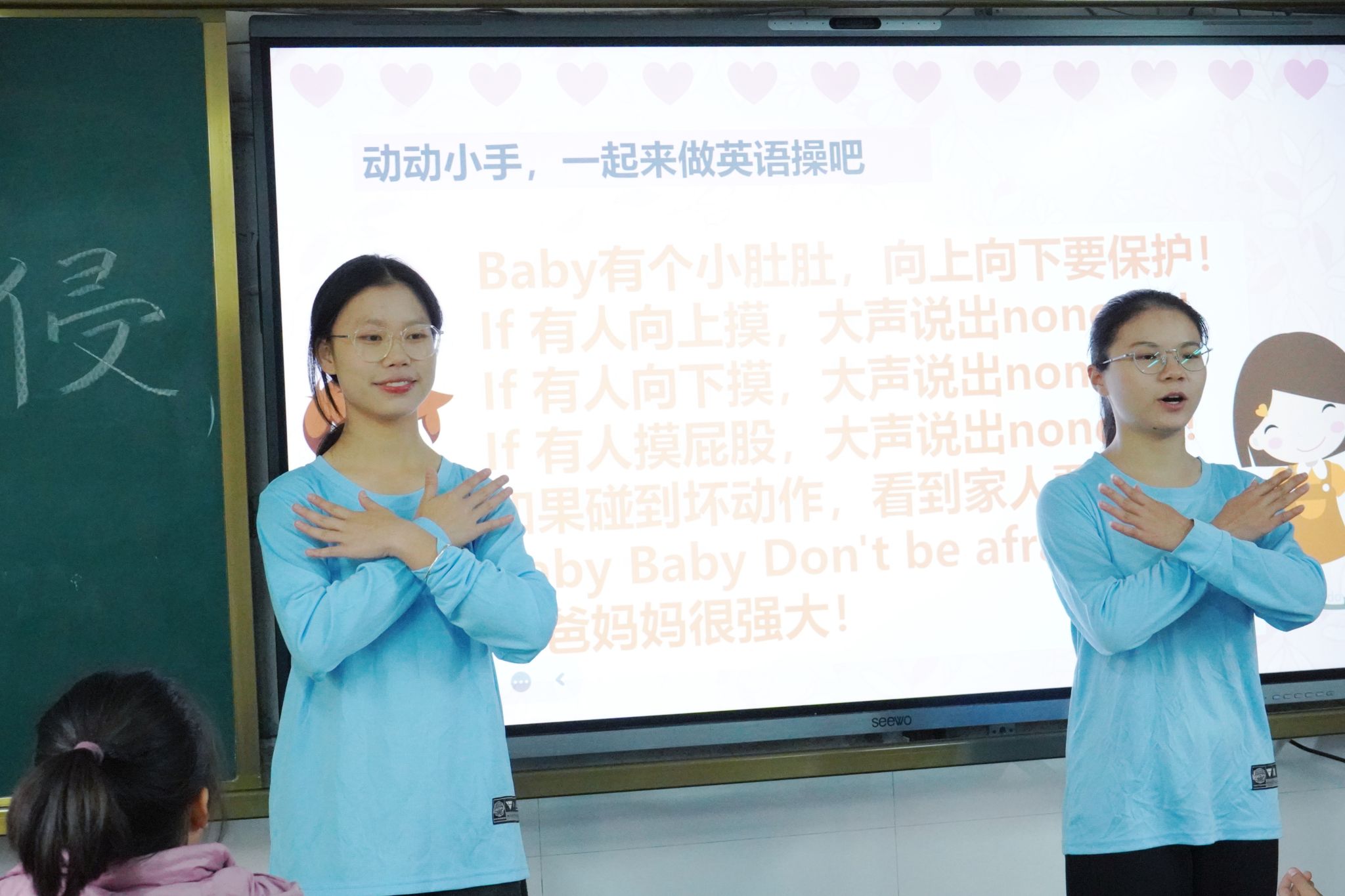 后半段课堂里,宣讲团结合专业特色,将英语操融入安全教育:“Baby有个小肚肚,上上下下要保护……”欢快的节奏配上活泼的肢体动作,安全知识变成了朗朗上口的歌谣。孩子们跟着律动摆动手脚、大声跟读,防性侵的意识也跟着旋律在心里慢慢扎根。到了随堂问答环节,孩子们逻辑清晰地抢答,每一个认真的回答都能换来一颗甜糖果,这份小甜蜜,让安全意识的种子在心里扎得更牢。