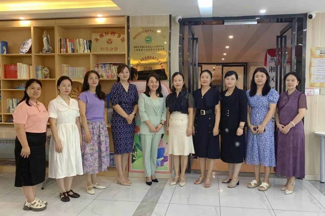(湖南省妇联党组书记、主席杨兰英来“她世界”女生教育工作室调研(左四杨兰英,左五:校党委书记刘子兰,左三:校党委副书记陈敏,左七:校党委委员、组织部部长唐艳))