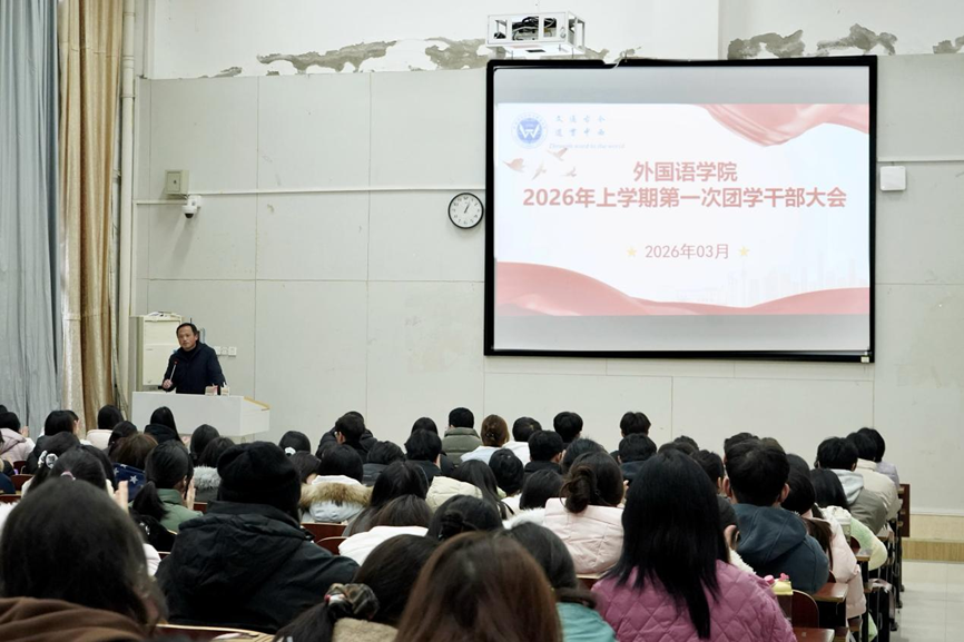 3月9日,yL23411永利集团官网登录在外语楼北110教室召开2026年新学期第一次团学干部大会。学院党总支书记周华、党总支副书记欧阳竹、学工办主任邱国周、辅导员曾超出席会议,第二十七届分团委学生会全体成员、2022-2025级班长团支书以及年级委员会成员参会,会议由欧阳竹主持。
