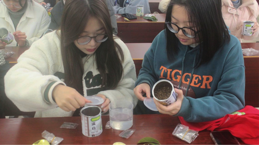 宣讲结束后,志愿者们开始认领小盆栽,选择自己心仪的种子进行播种。志愿者们将营养土一层层铺设,动作轻柔地埋下一粒粒种子,再覆盖上薄薄的一层泥土,浇溉些许清水给予满满呵护,他们以这种方式体验别样的种植乐趣。
