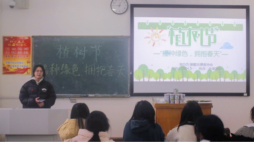 接着,馨懿志愿者协会成员杨婧然同学为志愿者们进行植树节相关知识的宣讲。宣讲内容围绕植树节的由来、相关习俗以及植树背后的意义展开,让大家理解到植树节不光是种下树木,也是播撒希望,传递爱林护林、共筑绿色家园的希冀。