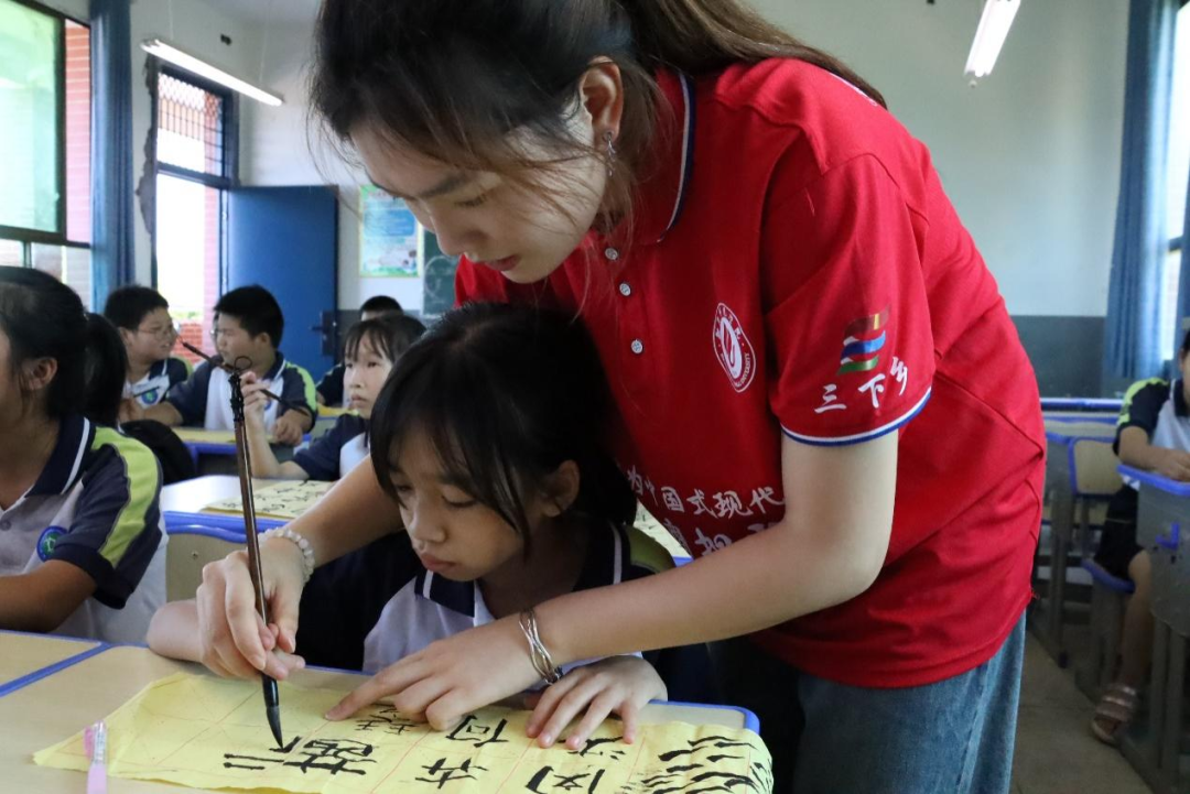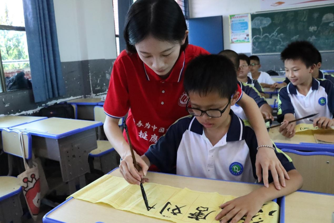 (志愿者教小朋友们练习毛笔字)
