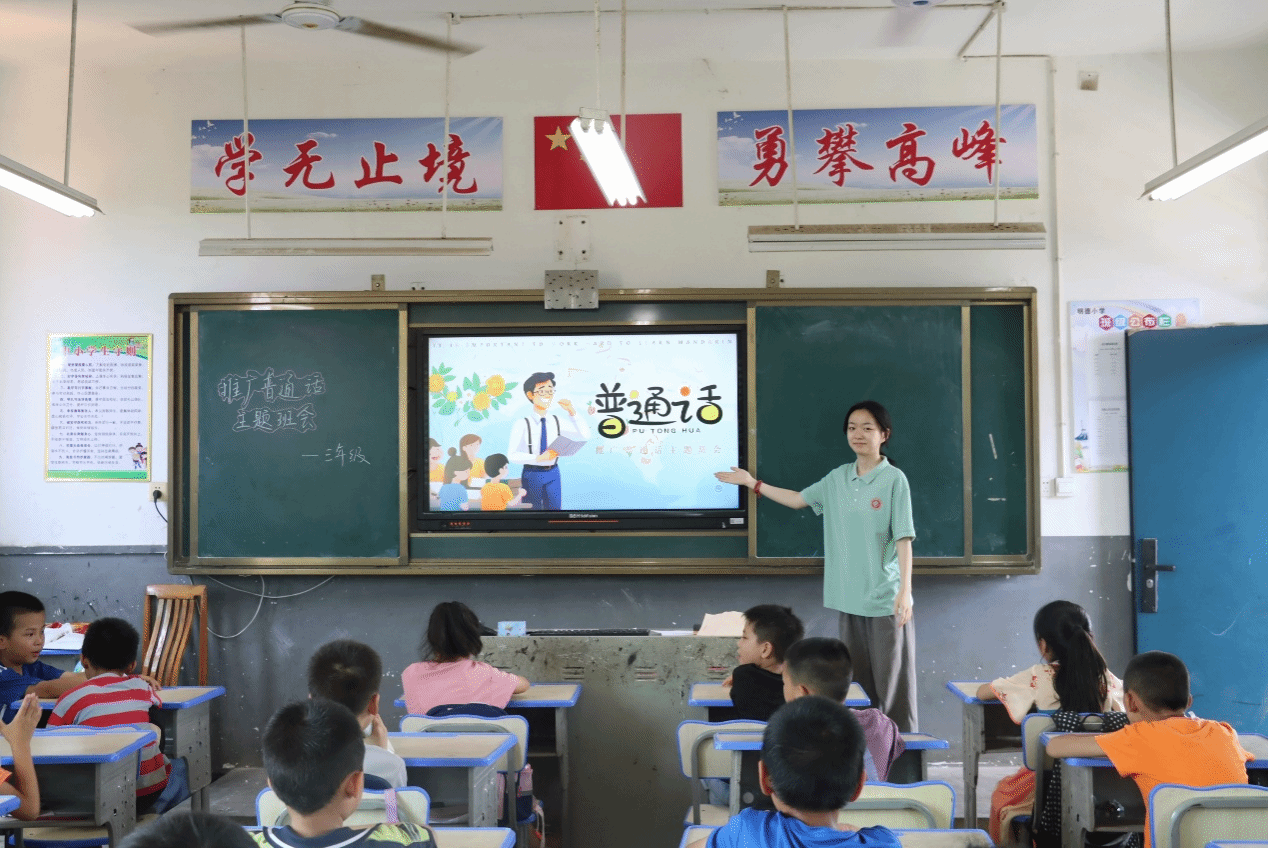 “四是四,十是十……”教室里传来孩子们字正腔圆的绕口令声。志愿者们以游戏化教学方式,通过绕口令挑战、情景对话、诗歌朗诵等活动,帮助孩子们纠正发音,提升普通话表达能力。针对部分家庭使用方言交流的情况,团队发起“小小推普员”计划,鼓励孩子们回家后担任“家庭普通话小老师”,带动家长共同学习。“我现在每天教爷爷奶奶说普通话,他们学得可认真了!”一位参与活动的孩子自豪地说。