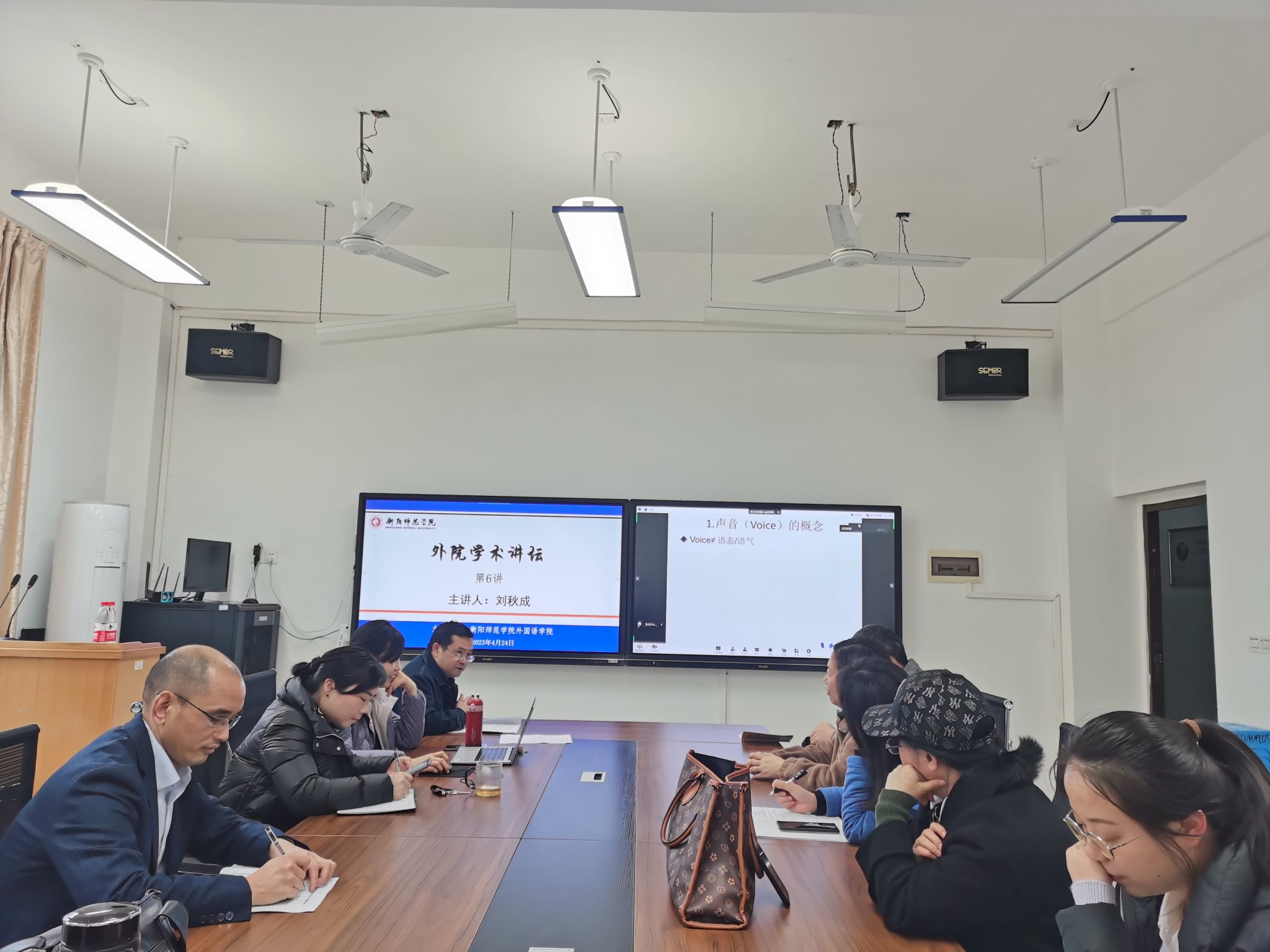 2023年4月24日下午yL23411永利集团官网登录2023年上学期学术讲坛系列活动第6讲在外语楼南311研究生会议室举行。刘秋成老师为我院教师作了一场题目为《二语学术写作中的声音构建研究:回顾和展望》的学术报告。讲座由邬德平博士主持,我院刘剑院长、何文娟副院长以及英语系、翻译系和商务英语系的部分教师参加了本次讲座。