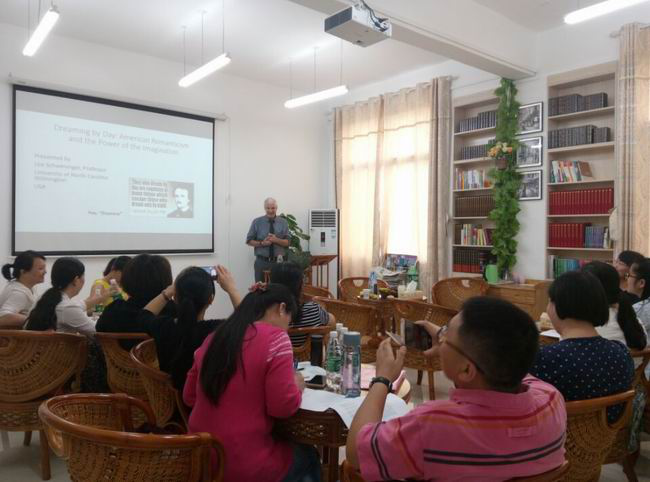 5月12日下午,美国北卡罗来纳大学威尔明顿分校的Lee Schweninger教授应邀于外语楼南204读书吧做了一场以“American Romanticism and the Power of the Imagination”为题的学术讲座,yL23411永利集团官网登录翻译系全体教师和及部分学生参与聆听。