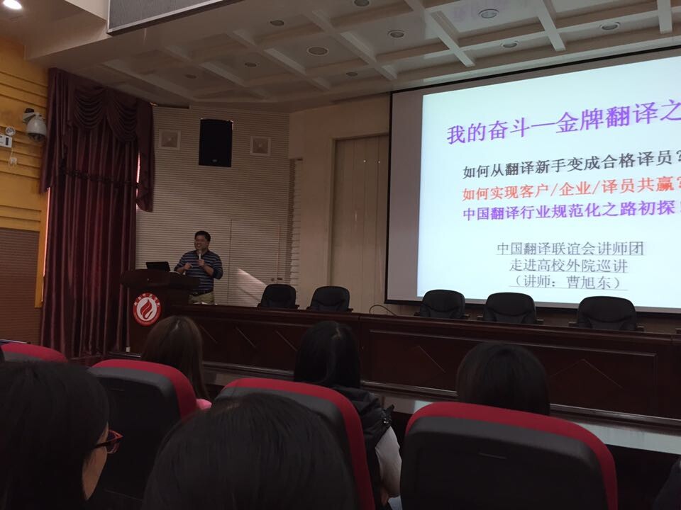 曹先生从事笔译工作,他用自己的亲身经历告诉学生:兴趣是最好的导师,他从事翻译是因为兴趣爱好,他的梦想就是把自己创建的译无止境平台打造成为翻译行业的阿里巴巴,他把自己从事笔译工作的经验毫无保留地传授给了学生,鼓励学生多从事翻译实践,在实践中发现错误,不断进步。