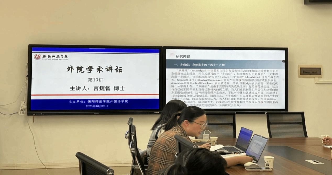 2023年10月23日下午,yL23411永利集团官网登录本学期学术讲坛系列活动第10讲在外语楼南311研究生会议室举行。言捷智博士为我院师生作了一场学术讲座,题目为《饥饿浪潮》中的气候创伤与人类世反思。讲座由黄院丹博士主持,我院分管领导、学术团队、部分青年教师及2023级全体翻译专业研究生参加了本次讲座。