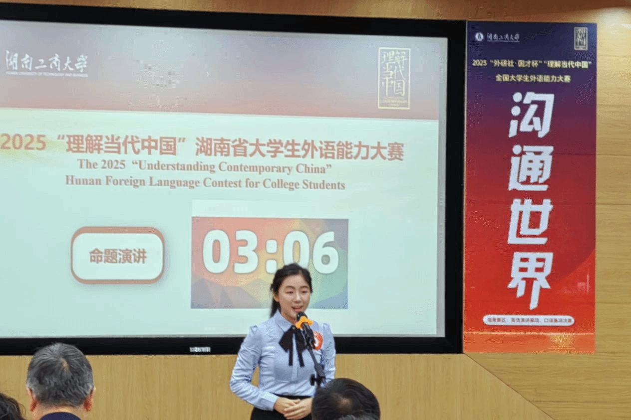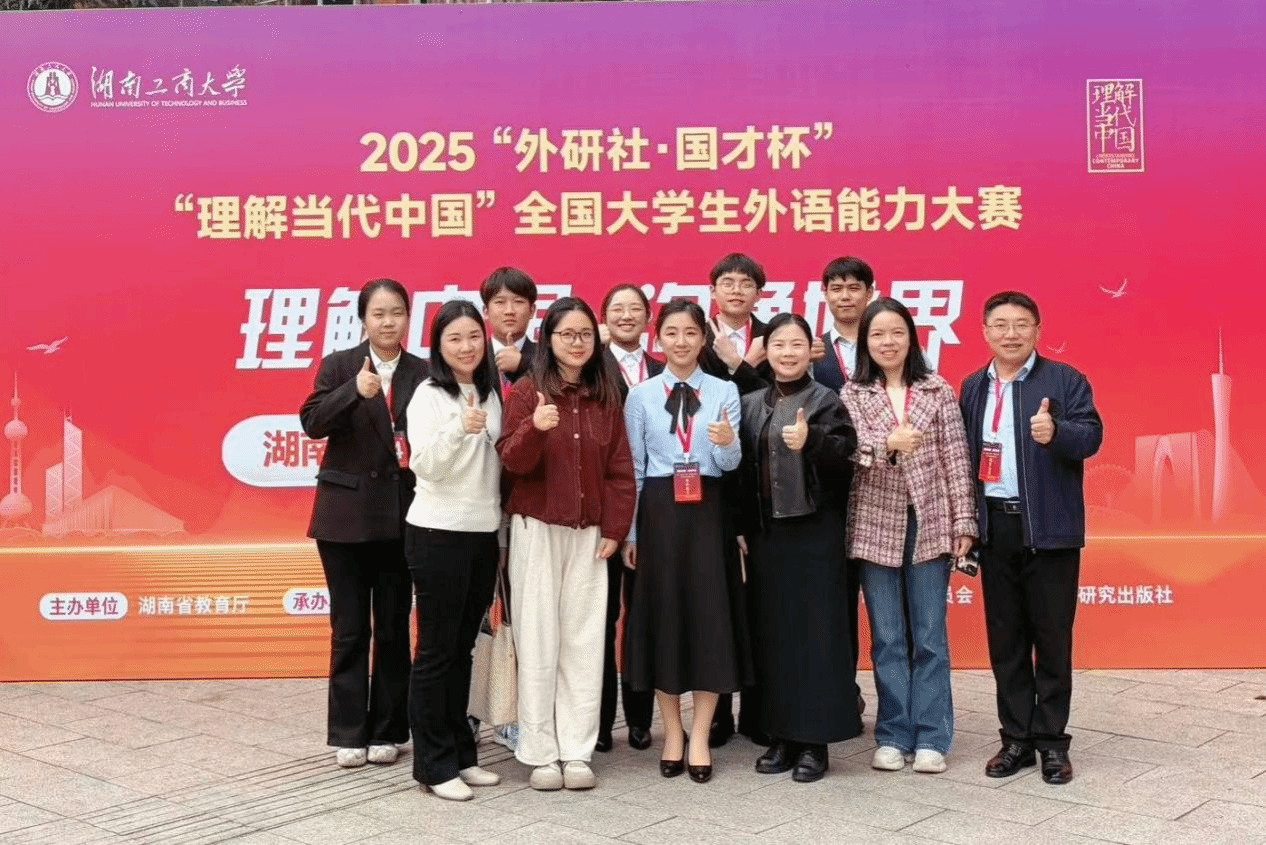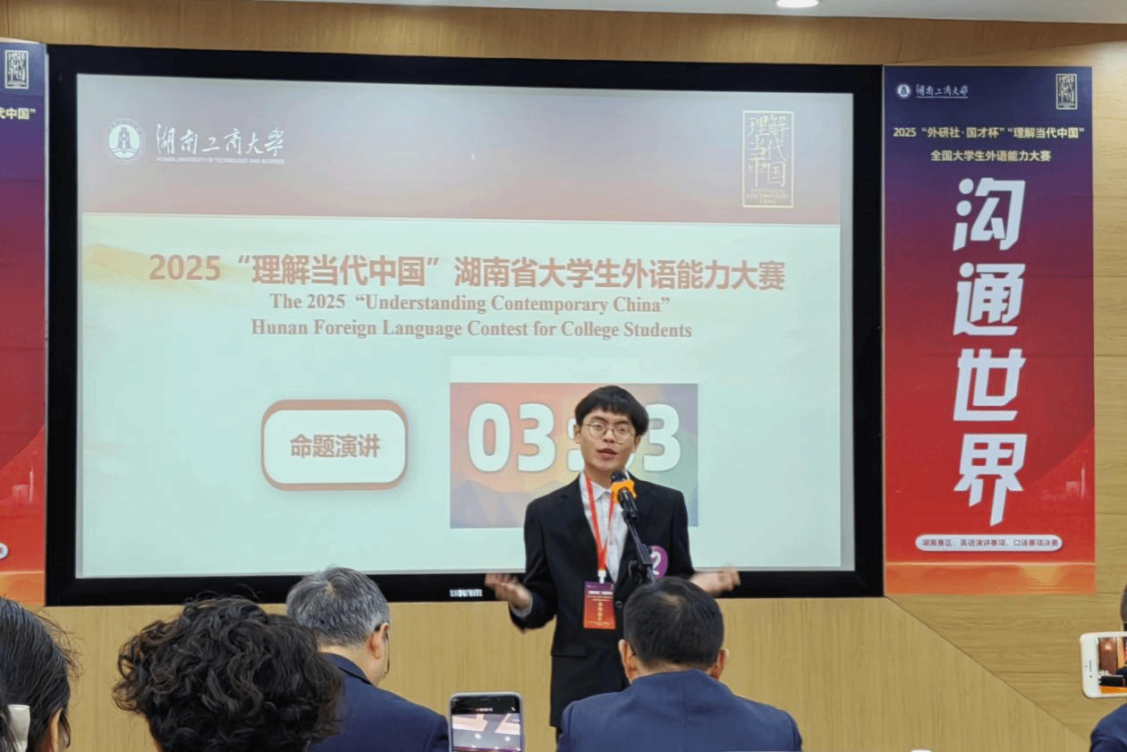群雄逐鹿展风采,以赛育人谱新篇。2025 年 10 月 24 日至 26 日,由湖南省教育厅主办、湖南工商大学承办的 “2025 年外研社・国才杯‘理解当代中国’湖南省大学生英语能力大赛” 成功举办。本次大赛以习近平新时代中国特色社会主义思想为指引,深入贯彻党的二十大精神,紧扣立德树人根本任务,着力推进 “三进” 工作走深走实,为高校外语教学改革提供实践支撑,为学子搭建语言实践与跨文化交流的优质平台,助力培养兼具家国情怀与国际视野的实战型外语人才。