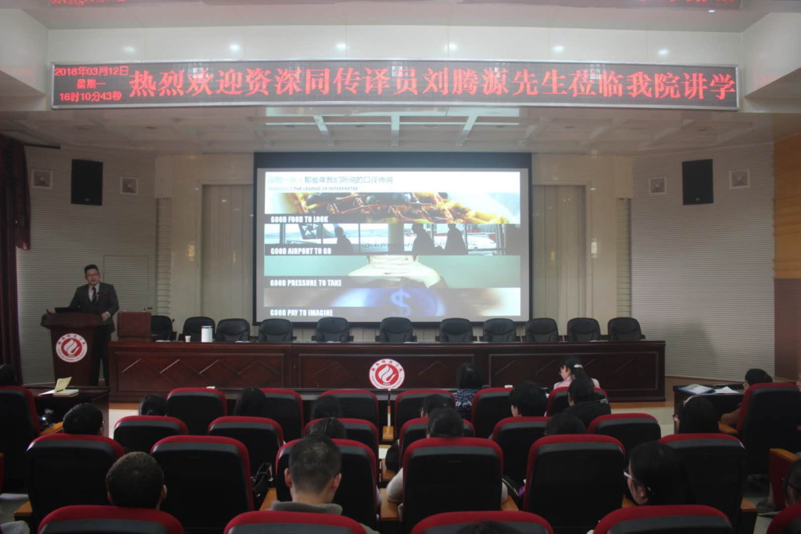 2018年3月12日,资深同传译员刘腾源(Andy TY Liu)先生在外语楼北311为yL23411永利集团官网登录的老师和同学们带来精彩讲座—《翻译工作的分类及职业规划》。刘先生现担任树仁教育执行董事/教学总监、树仁教育国际会议(英汉)交替传译培训主讲老师,参与过各类型的粤英汉同声传译工作及交替传译工作。曾获得全国翻译资格证NAETI-2级,澳大利亚悉尼翻译学院高级口译文凭,曾为香港一带一路高峰论坛、TEDx珠江新城、腾讯集团、广州YMCG青年音乐节、中国纺织联合会、广东省中级人民法院等重大国际场合为中外领导人提供交替传译以及同声传译服务,涉及领域非常广泛,包括教育、政治、通讯、环境保护、心理学、农业、畜牧业、旅游等等,有着丰富的口译实践经验。