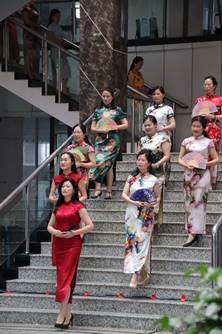 首先,科大旗袍协会成员为大家带来了旗袍秀节目《我和我的祖国》。伴随着悠扬悦耳的音乐,身着各色各样旗袍的教师从楼梯上缓缓走下,优雅的步伐与姣好的身姿给师生们留下了深刻的印象,它让我们感受到了中华文化独具特色与韵味的美感。