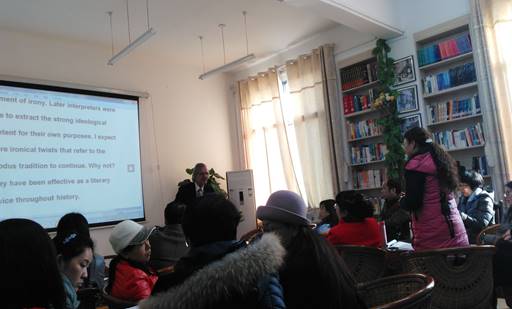 Ramey博士从宗教与文学的关系出发,阐述了《出埃及记》与非裔美国文学作品发展的内在联系。他介绍了《出埃及记》的主要内容,并以具体的文学作品为例,指出宗教对美国文学的发展有着深刻的影响,《出埃及记》中摩西带领族人逃离埃及与非洲黑奴被贩卖到美洲有一定程度的类似,因此非裔美国文学隐约存在着《出埃及记》似的情结,这在很多非裔美国文学作品中均有体现。英美文学大量引用《圣经》中的典故,因此了解西方宗教发展史对于深刻领会英美文学作品,避免简单肤浅的解读有着非常重要的意义。Ramey博士风趣幽默,妙语连珠,现场气氛轻松活泼,不时爆发出热烈的掌声。最后Ramey博士还耐心细致地回答了师生们的提问,并勉励全体教师以更大热情投入文学教学。