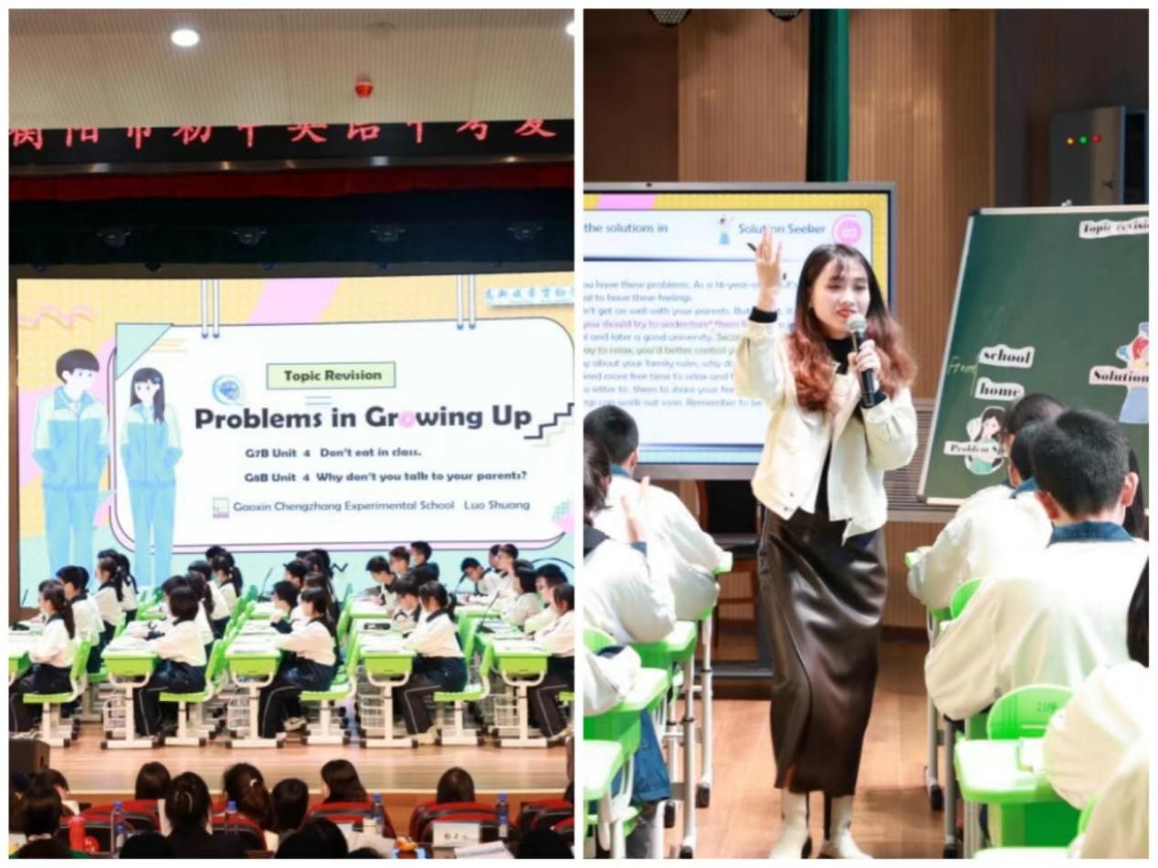 高新成章实验学校初中英语教研组长罗双老师将人教版教材七年级上册Unit 4 Don’t eat in class.与八年级下册Unit 4 Why don’t you talk to your parents? 进行整合,讨论了学生们成长过程中可能遇见的各种问题。从寻找问题、探求解决办法和提出实质性建议三个层面一步一步升级课堂教学任务,润物于无声之处,学生们在用中学,学中用,达到知行合一的目的。