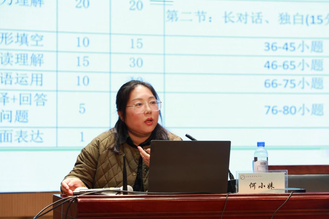 下午,广东外语外贸大学英文学院教授冯光武以《语篇意识 英语阅读 中学英语教学》为主题开展了专题讲座,从四个方面深度解读英语阅读中的语篇意识。岳阳市教育科学技术研究院义务教育阶段英语教研员何小妹从命题依据、命题思路、试卷结构和各题型具体考点为我们解读了新中考的特点,指明了中考复习备考方向。