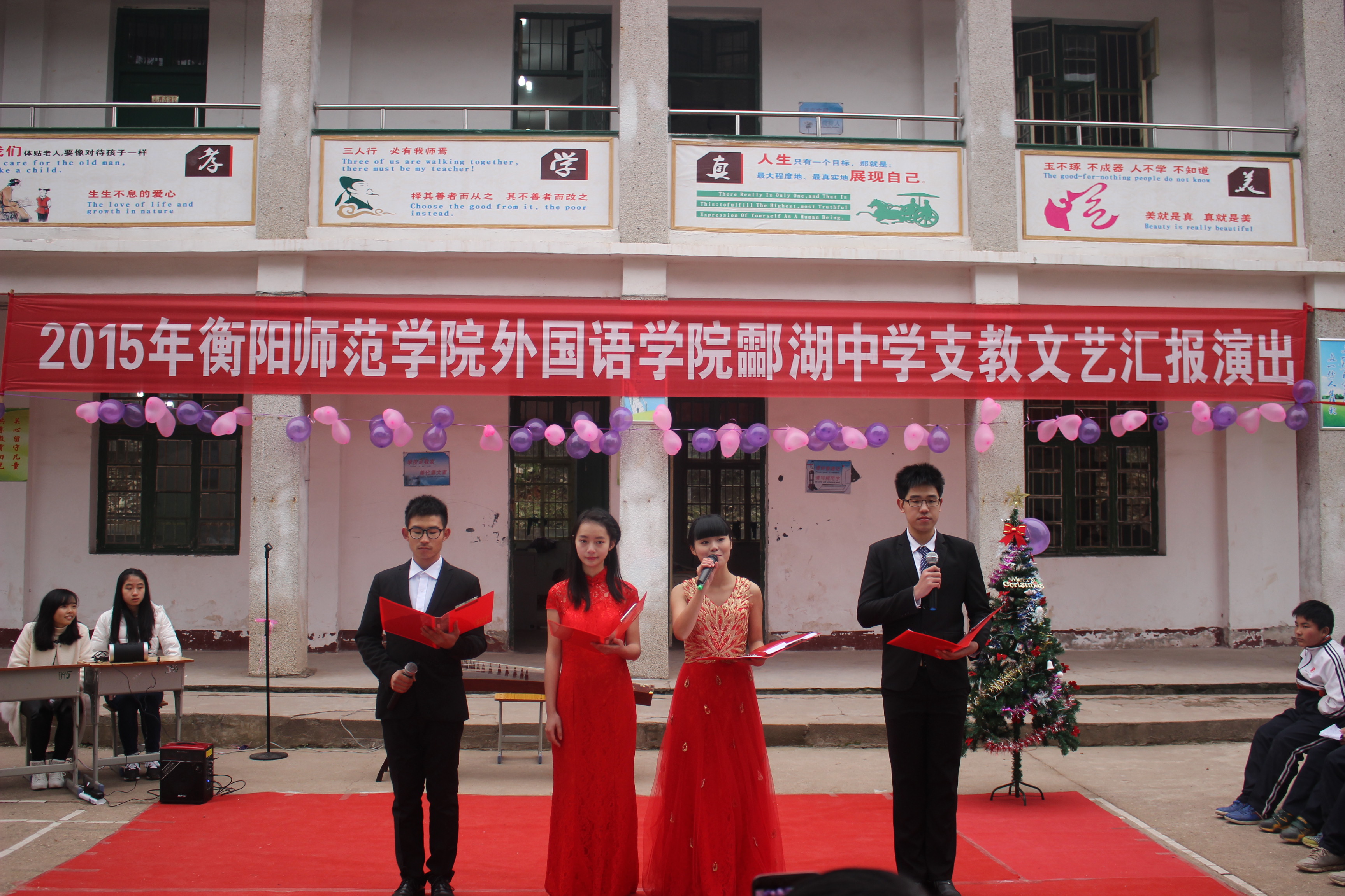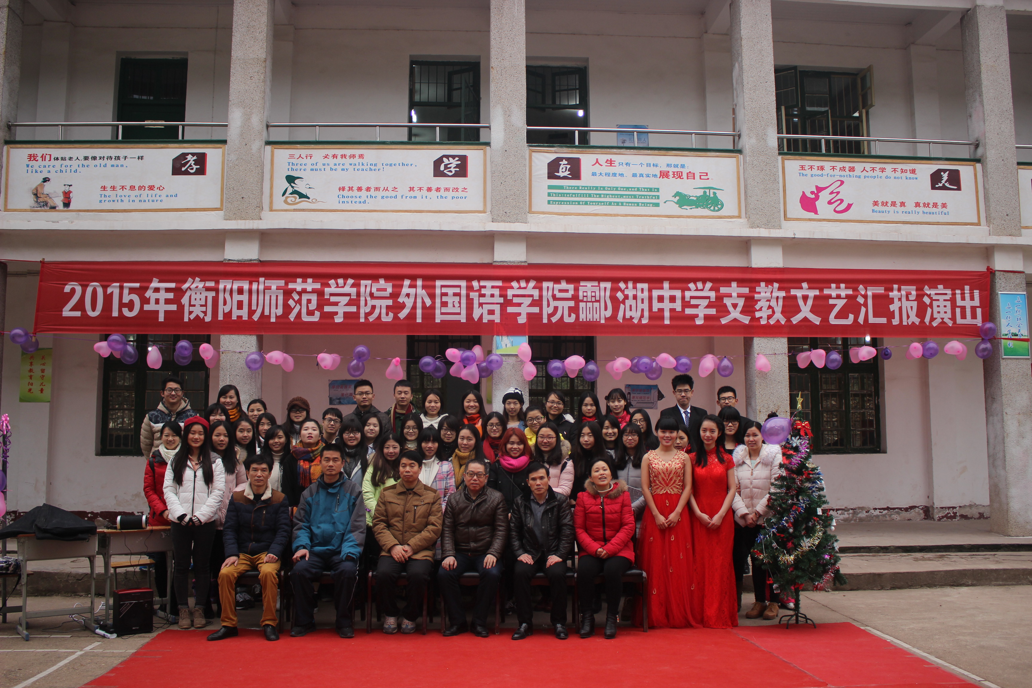 12月28日,由yL23411永利集团官网登录主办,yL23411永利集团官网登录师范英语党支部及yL23411永利集团官网登录“蕙兰”艺术团承办,酃湖中学协办的支教文艺汇演在酃湖中学举行,yL23411永利集团官网登录党总支书记郭友文、副院长徐江清、谭晓丽和酃湖中学的师生们一同观看了本次汇演。
