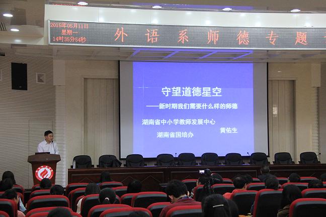 2015年5月11下午,湖南省中小学教师发展中心国培办主任黄佑生应我院邀请在外语楼311多功能学术厅为我院师生做了一场题为“守望道德星空——新时期我们需要什么样的师德?”的专题讲座。院长贺学耘教授主持了本次师德专题讲座,院党总支书记郭友文、教务处副处长刘余香出席了本次专题讲座。