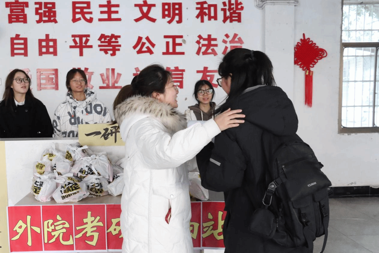 学院为每一位考研学子发放了“考研冲刺加油包”,祝愿考研学子能够一战成硕、金榜题名。学弟学妹们整齐划一地喊出加油口号:“旺仔旺仔志气高,考研路上步步骄。” 激昂的声音,饱含着对学长学姐们的深情祝福与殷切期待。大四辅导员陈琴笑容满面,幽默叮嘱,亲切拥抱每一位学子,鼓励他们坚定信心,轻松上阵,以最好的状态迎接挑战。