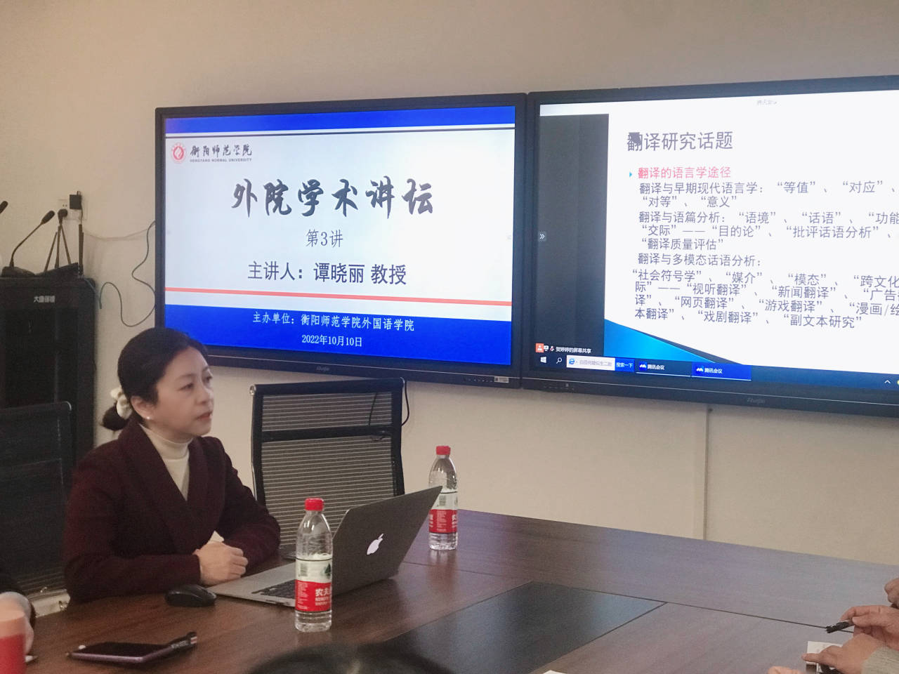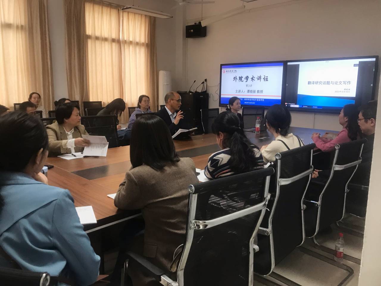 2022年10月10日,yL23411永利集团官网登录学术讲坛系列活动第三讲在外语楼南311研究生会议室举行。谭晓丽教授为我院教师作了一场学术报告,题目为:“翻译研究话题与论文写作”。讲座由刘剑院长主持,我院英语系、翻译系和商务英语系的部分教师参加了本次讲座。