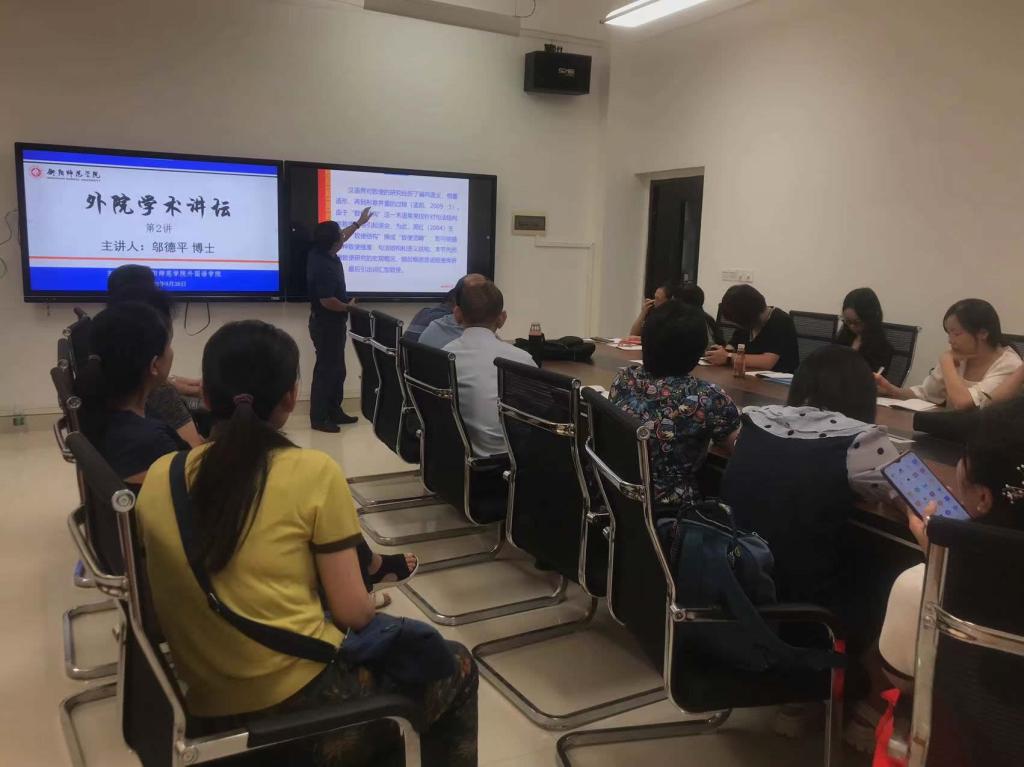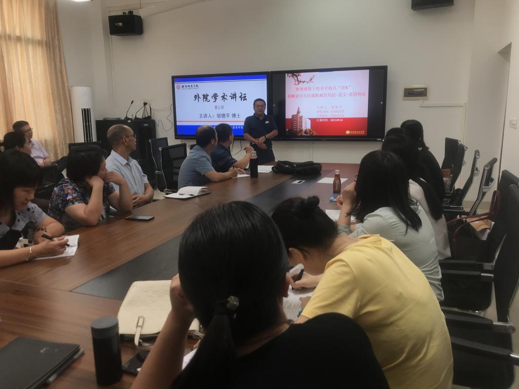 2022年9月26日,yL23411永利集团官网登录学术讲坛系列活动第二讲在外语楼南311研究生会议室举行。邬德平博士为我院教师作了一场学术报告,题目为:“致使观照下的双字构式‘劝X’:范畴划分与生成机制及句法-语义-语用特征”,其主要内容为他攻读博士学位期间的研究成果。该活动由吕凌云老师主持,我院英语系、翻译系和商务英语系的部分教师参加了本次讲座。