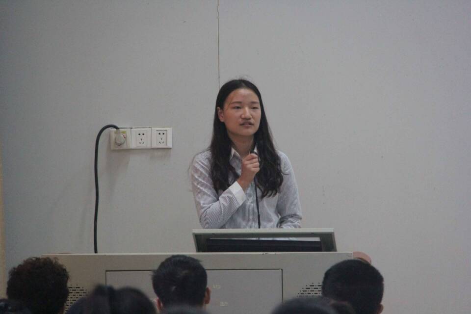 会议一开始,辅导员老师江子丹为大家介绍了本次会议的流程,会议大致分为五个部分:一、对新修订的《学生手册》的说明;二、学生会主席张婷源就第七届多媒体课件大赛和其他问题进行说明与强调;三、分团委常务副书记刘清对近期工作以及活动开展作介绍;四、辅导员张倩老师对于奖助学金评定的安排与要求;五、郭书记讲话。