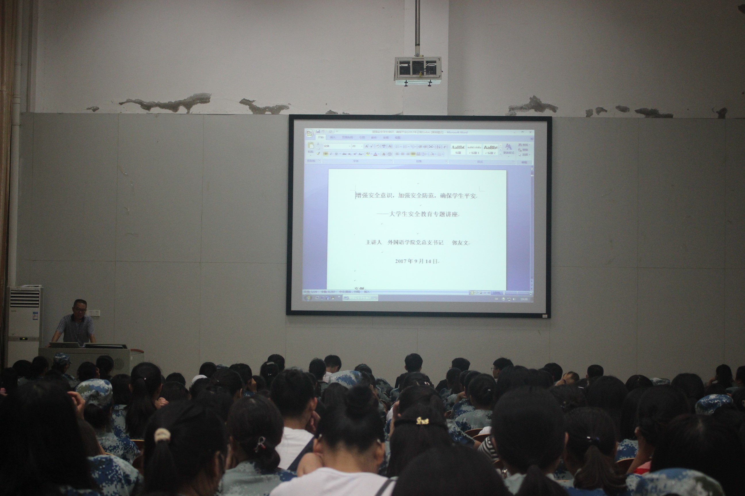 2017年9月14日晚,yL23411永利集团官网登录于外北110教室开展“增强安全意识,加强安全防范,确保学生安全”的安全教育专题讲座。本次讲座由yL23411永利集团官网登录党总支书记郭友文担任主讲人,17级全体学生参加了此次会议。