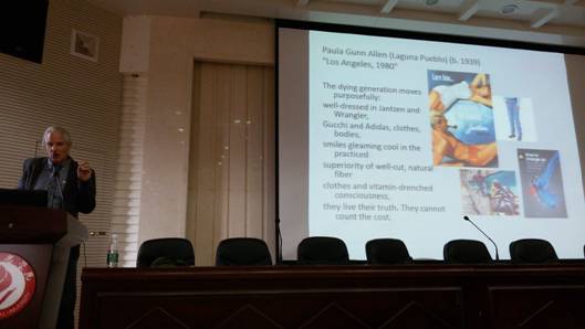 5月23日下午, 美国北卡罗来纳大学Lee Schweninger教授应邀在我院外北311做了题为American Indian Literature and the American Dream的讲座,yL23411永利集团官网登录全体教师及部分学生出席了讲座。讲座中Schweninger教授侃侃而谈,图文并茂,详细介绍了北美印第安人的历史、当前印第安人的生存状态、美国印第安文学及印第安人在美国的未来前景等。Schweninger教授在讲座中指出印第安人对美国的物质文明和精神文明都做出了难以估量的贡献,引导大家对印第安人与美国梦关系的思考,同时教授还指出尽管印第安人在美国社会所处境地悲惨,但他们仍然保持着希望。