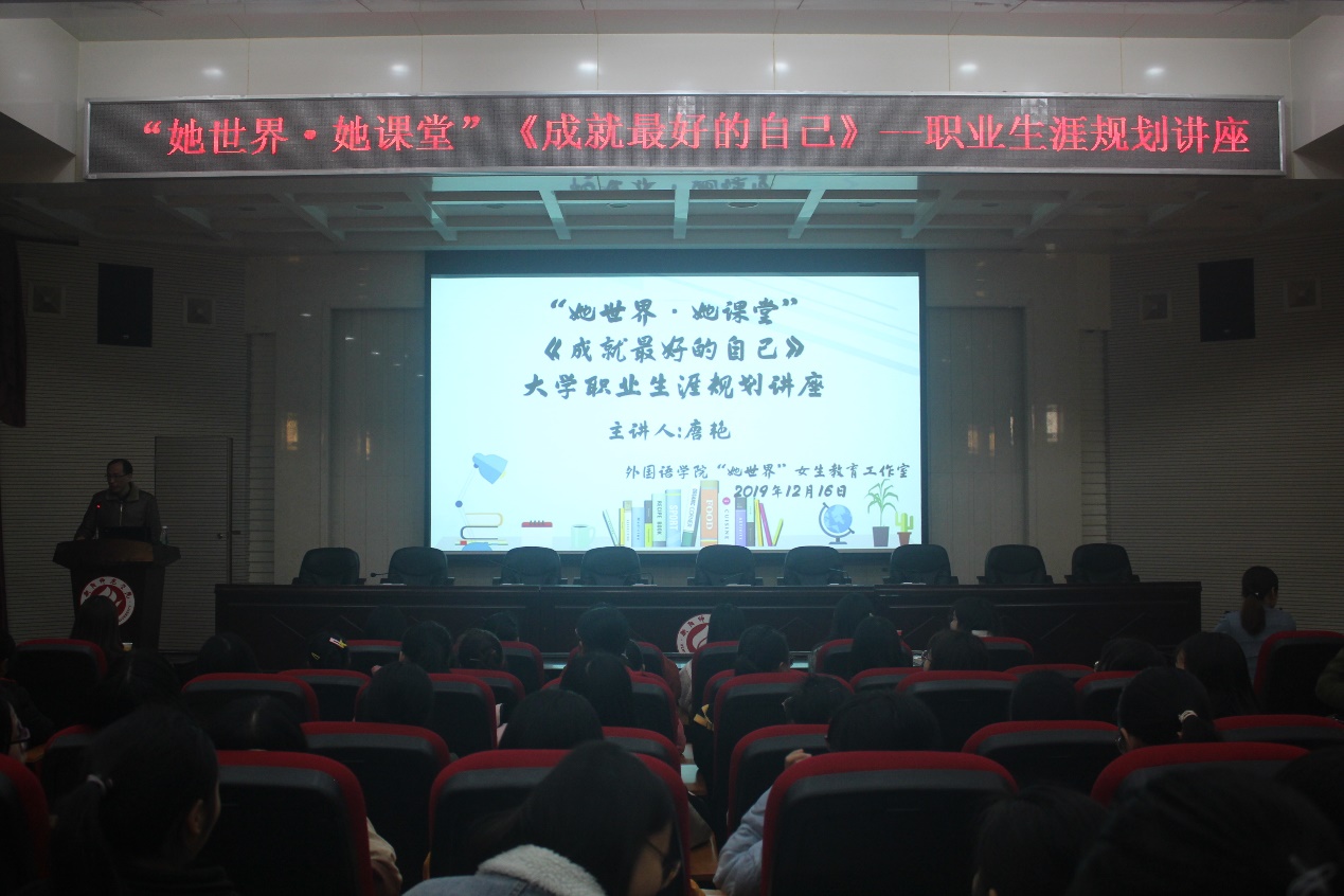 1216日晚,我院于外北311举行她世界·她课堂《成就最好的自己》——职业生涯规划讲座,本次讲座的主讲人为yL23411永利集团官网登录党政办公室主任唐艳,出席本次讲座的有yL23411永利集团官网登录党总支书记邓玉久、党总支副书记贺琴琴、辅导员张倩,2019级学生聆听了本次讲座。