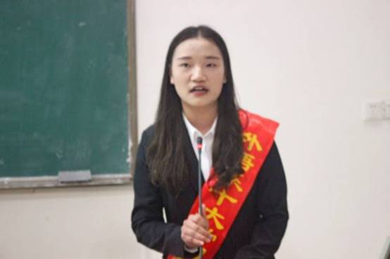 第三位分享者是来自1501班的张婷源,她浑身充满着一种自信的气场。在她的介绍中,她生于农村,家庭条件一般,这几年的学业与生活,她靠着是奖、助学金、和自己兼职赚的钱。在生活中常常看到有人抱怨自己的家庭,并以此作为堕落的借口。但是她没有放弃自己的理想。她坚持每天起得比别人早一点,睡得比别人晚一点,效率再高一点,最终以优异的成绩和出色的工作获得师生的赞赏。“命运给你一个比别人低的起点,是想告诉你,让你用一生去奋斗出一个绝地反击的故事。