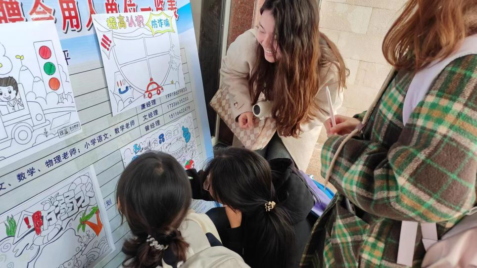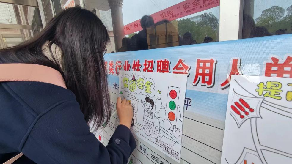 外语楼的大门外竖着一张展板,上面铺满了等待着填色的安全手抄报,同学们从工作人员的手中接过画笔,站在展板前,尽情地在上面铺陈着心中的色彩,为黑白线稿注入活力。