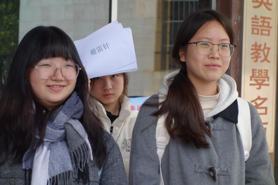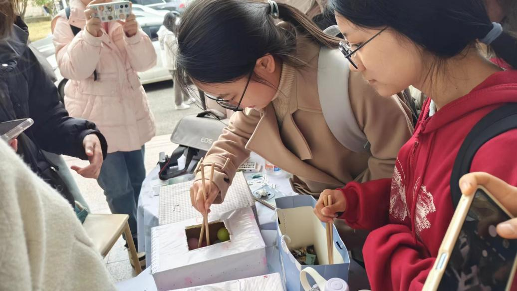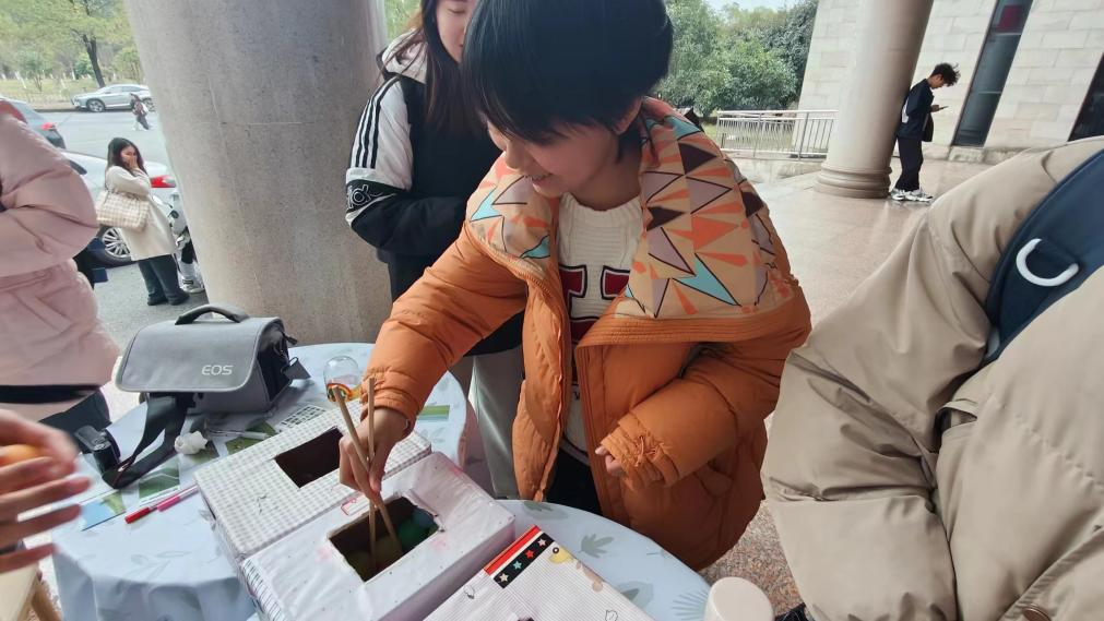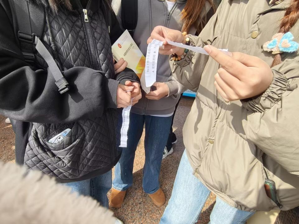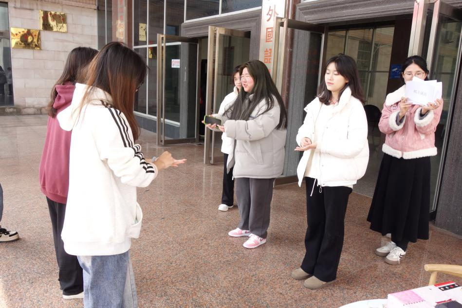 同学们齐聚外语楼门口,准备热情参与一场特别的的“你来比划我来猜”活动,不同于往常娱乐性质的游戏,这次游戏的每个题目都将围绕日常生活中的安全概念展开。负责比划的同学脑洞大开,或做出蜷缩保护头部的动作示意地震避险,或模拟按下电梯紧急按钮的样子。这些富有创意且形象的动作不仅加深了大家对安全常识的印象,也让整个活动充满了欢笑和掌声。负责夹乒乓球的同学则在一旁随时准备着,待题目答对之后小心而坚定地夹起乒乓球送到指定位置,愈加显现出每一组团队无言的默契。