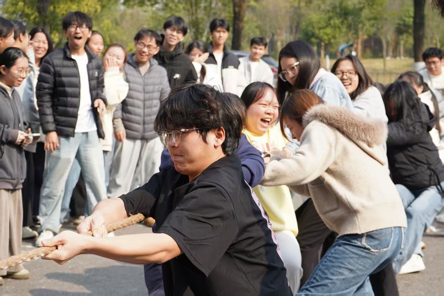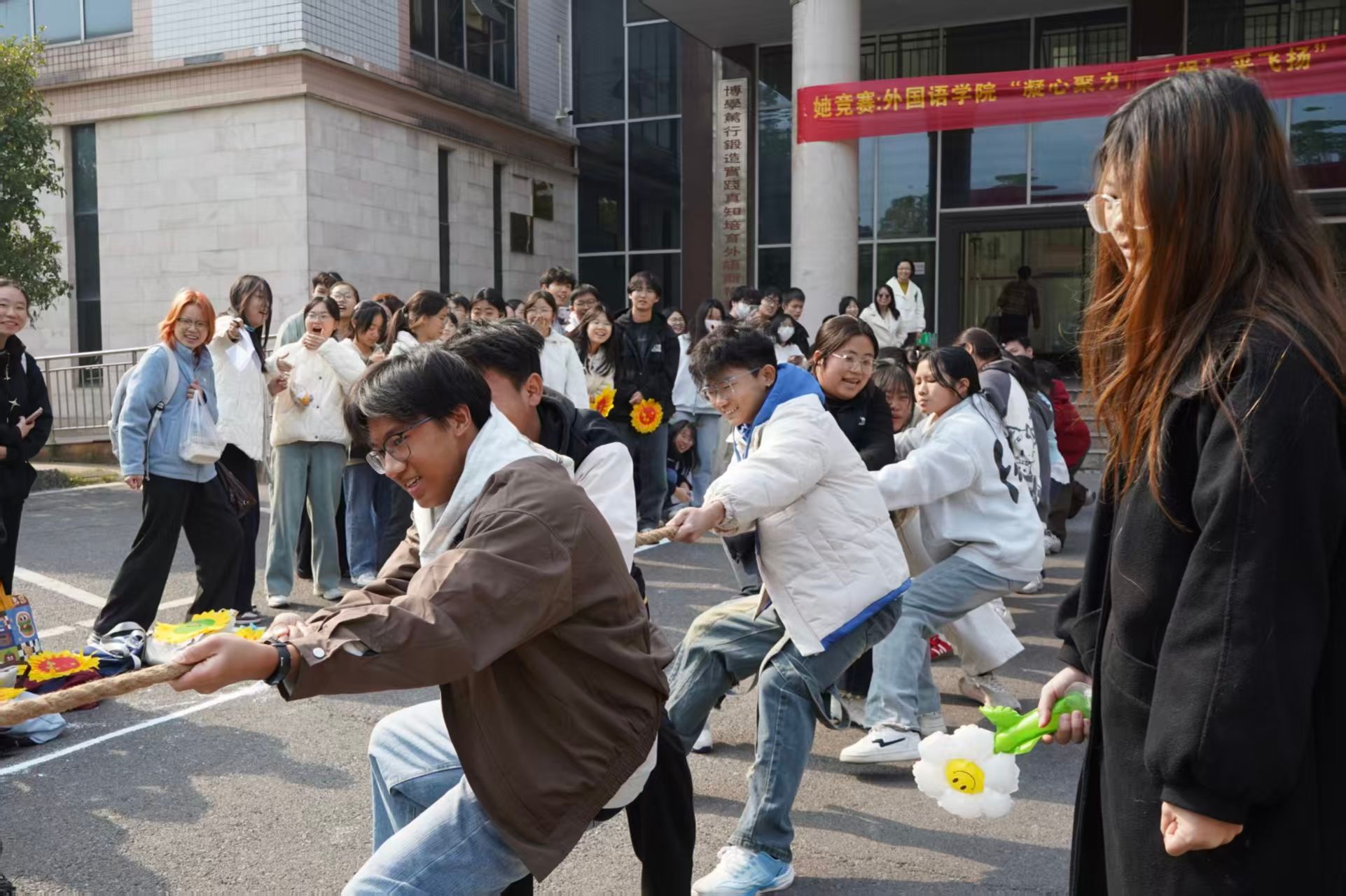 凝绳聚力同心战,众志克艰胜势扬。赛场上队员们心往一处想、劲往一处使,紧握长绳奋力拼搏,赛场边助威呐喊声此起彼伏,充分展现了外院学子们昂扬向上的竞技状态与团结协作的优良风貌。此次比赛以体育竞技为纽带,不仅锤炼了同学们坚韧不拔的拼搏精神、涵养了积极进取的生活态度,更传递了“同舟共济、奋勇争先”的集体主义精神。期待外院学子将这份同心协力、顽强拼搏的力量,转化为学习生活中的奋进动力,汇聚集体合力,为yL23411永利集团官网登录高质量发展添砖加瓦。