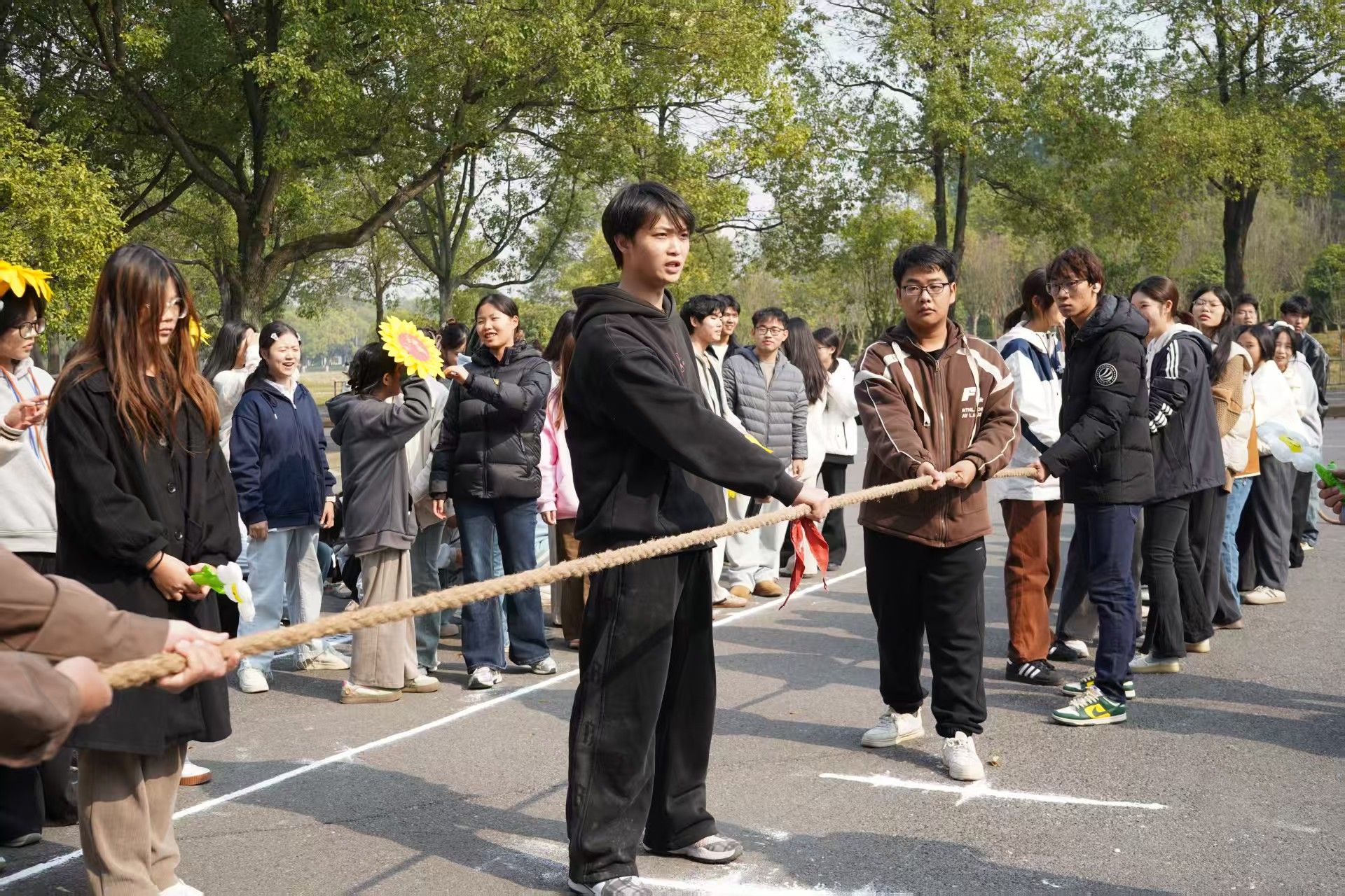 比赛哨声一落,拔河绳便被瞬间绷紧,两侧的参赛队伍齐齐沉下身子、扎稳脚步,腰背的弧度里攒着一股不肯松的劲。围观的人群中,加油声裹着风翻涌起来,有人举着装饰花束跟着队伍的节奏挥动,有人攥着拳头踮脚紧盯绳上的红绸——当红绸终于越过白线,哨声与欢呼声几乎同时炸开,喧闹的气息裹着青春的热意,整个现场都浸透着鲜活。