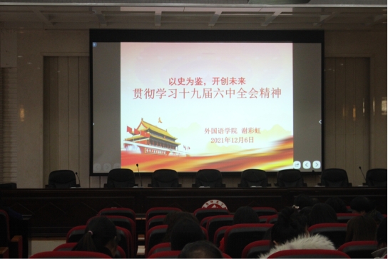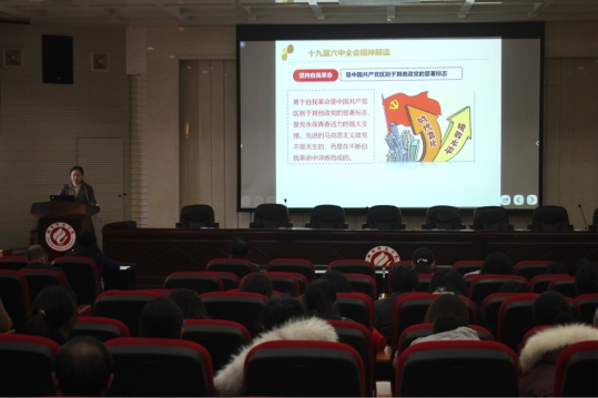 首先,谢彩虹副院长就十九届六中全会精神进行解读,并对十九届六中全会公报内容与《决议》精神进行了讲解。她指出十九届六中全会的重要成果及“两个确定”、“三个需要”、“马克思主义中国化的三次飞跃”几项重要内容。随后,她从三个方面向大家传达十九届六中全会精神: