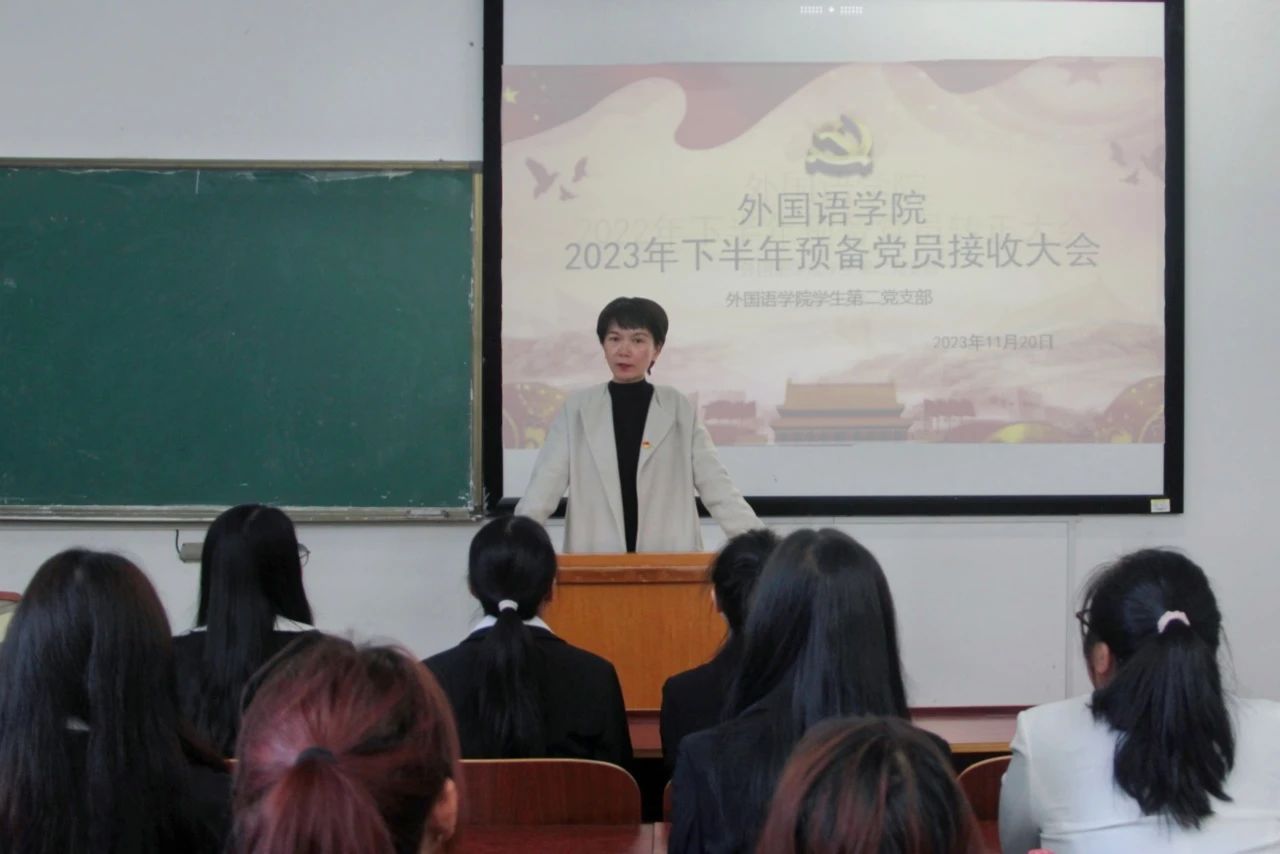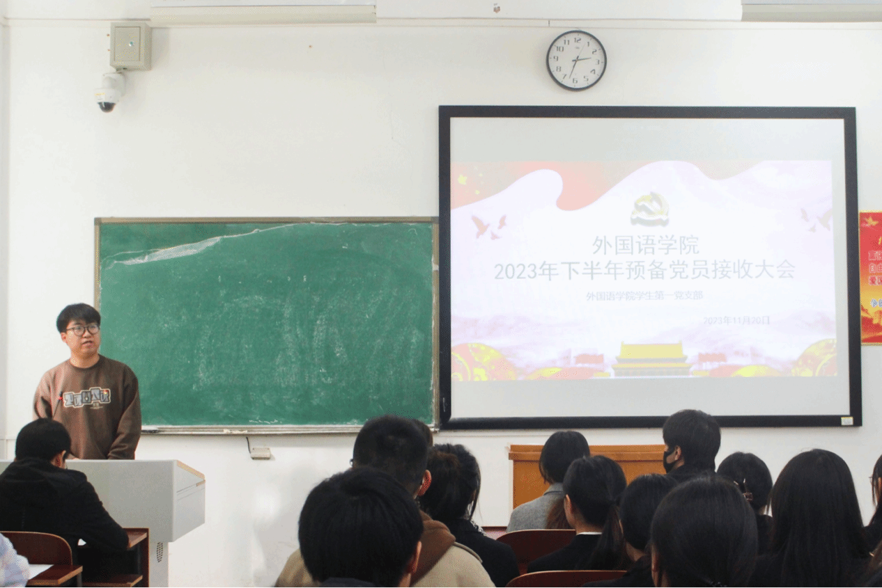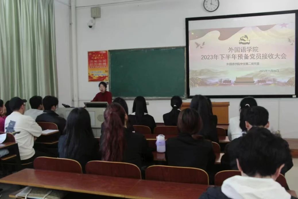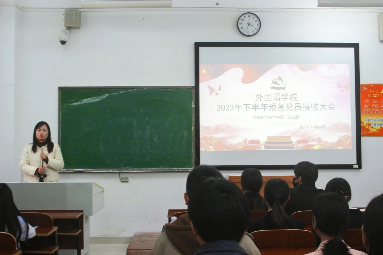 为进一步壮大党员队伍,不断增强党组织的凝聚力、战斗力和创造力,11月20日下午,我院学生第一、第二党支部分别于外语楼北102、104教室召开2023年下半年预备党员接收大会,学生第一党支部书记刘志伟、第二党支部书记陈琴主持会议,党总支书记贺琴琴、副书记欧阳竹出席会议,学工办主任邱国周、辅导员龚晨阳、全体学生党员、发展对象及其入党介绍人参加会议。