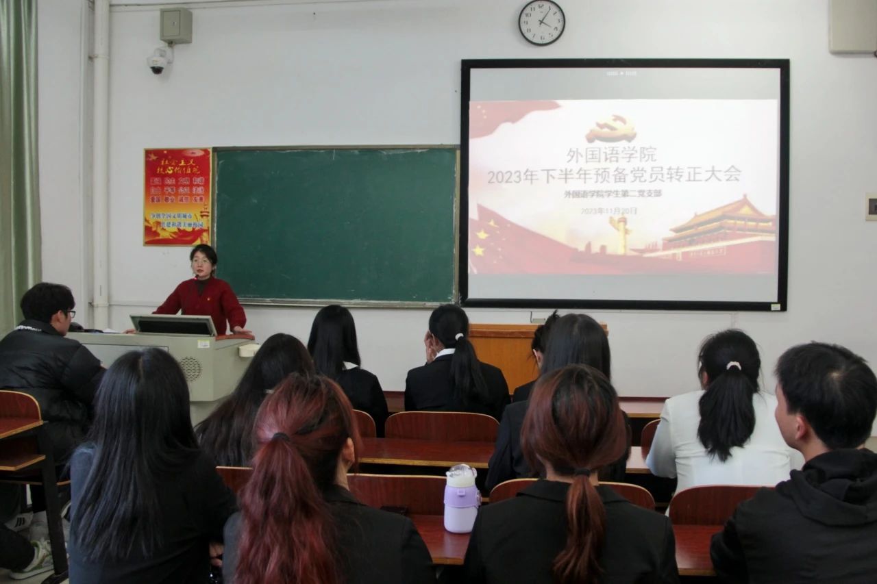 11月20日下午,我院学生第一、第二党支部分别于外语楼北102、104教室召开2023年下半年预备党员转正大会,大会审议、讨论、表决了关于鲁瑶等13位预备党员的转正问题。会议由我院学生第一党支部书记刘志伟、第二党支部书记陈琴主持,党总支书记贺琴琴、副书记欧阳竹出席会议,学工办主任邱国周、辅导员龚晨阳、13名预备党员及其入党介绍人和全体学生党员参加会议。