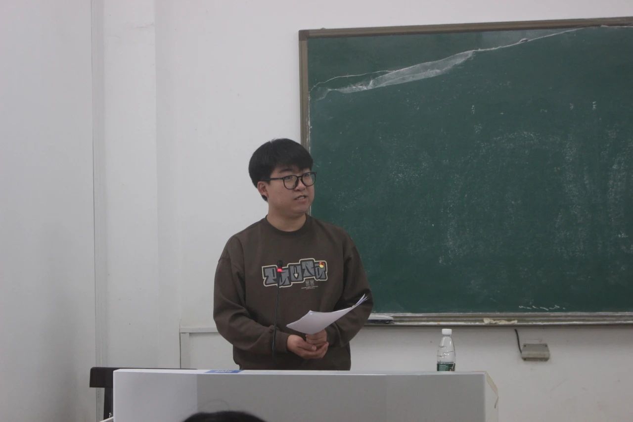 (学生第一党支部书记刘志伟在外北102教室主持会议)