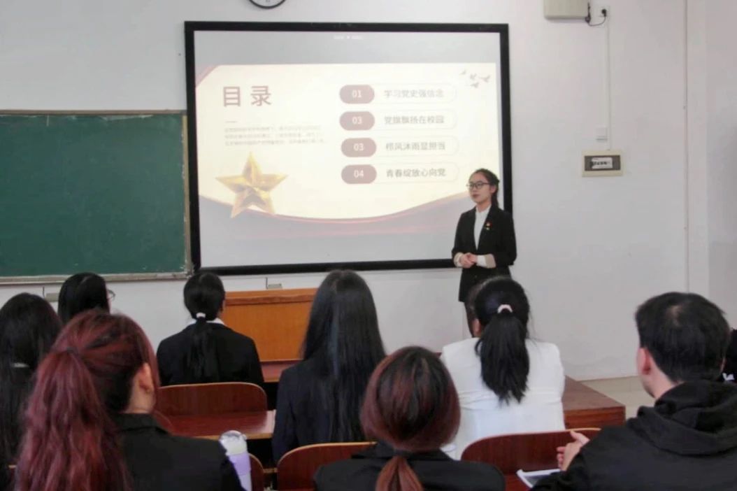 (学生第二党支部书记陈琴在外北104教室主持会议)