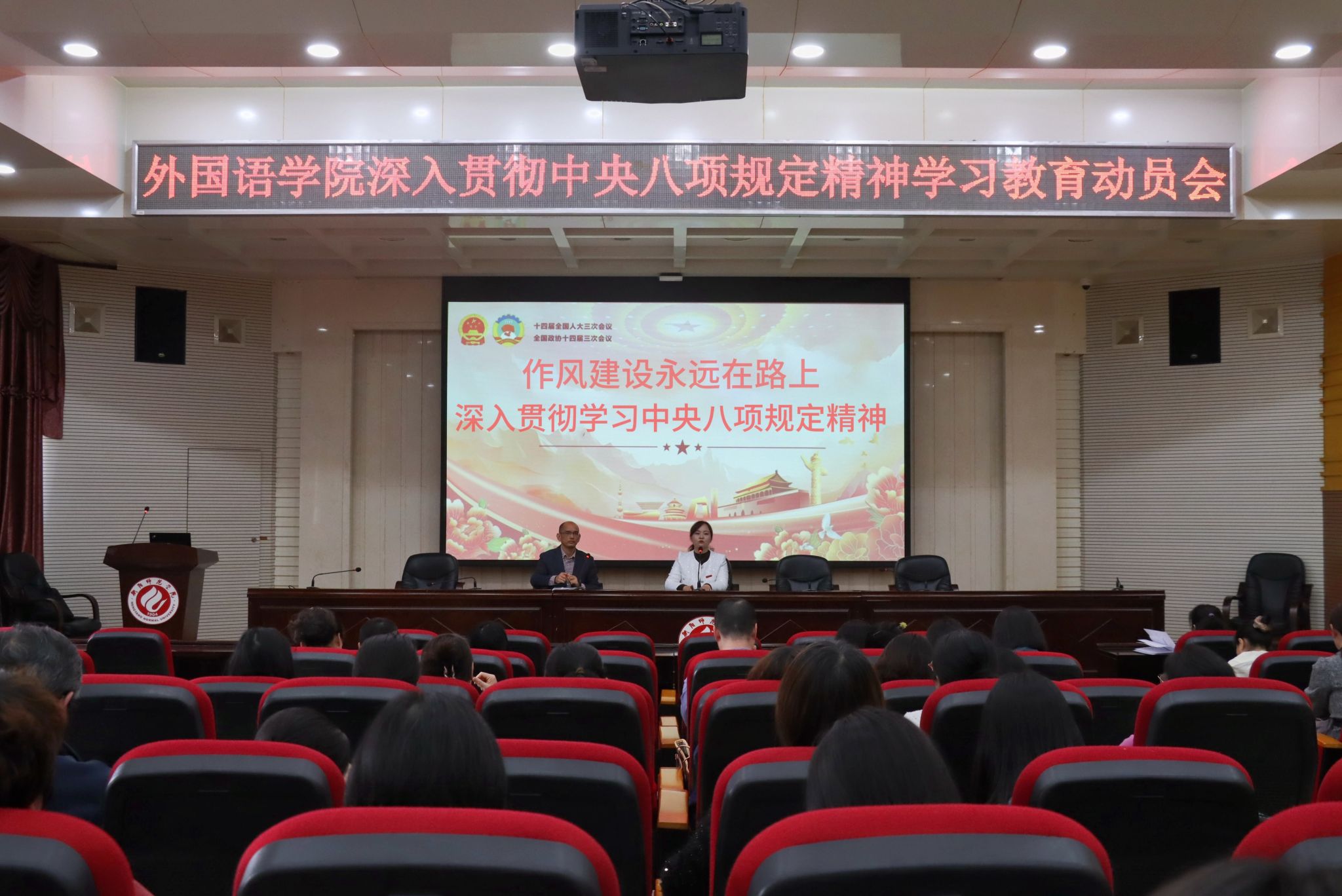 最后,会议传达学习了2025年全国两会精神和政府工作报告。会议指出,学院要把学习好、领会好、贯彻好全国两会精神作为重要政治任务,把两会精神融入教书育人全过程,以实际行动落实国家战略部署,聚焦教育强国、科技创新等议题,结合学科特色推进教育教学改革,致力于培养兼具家国情怀与专业能力的新时代外语人才。
